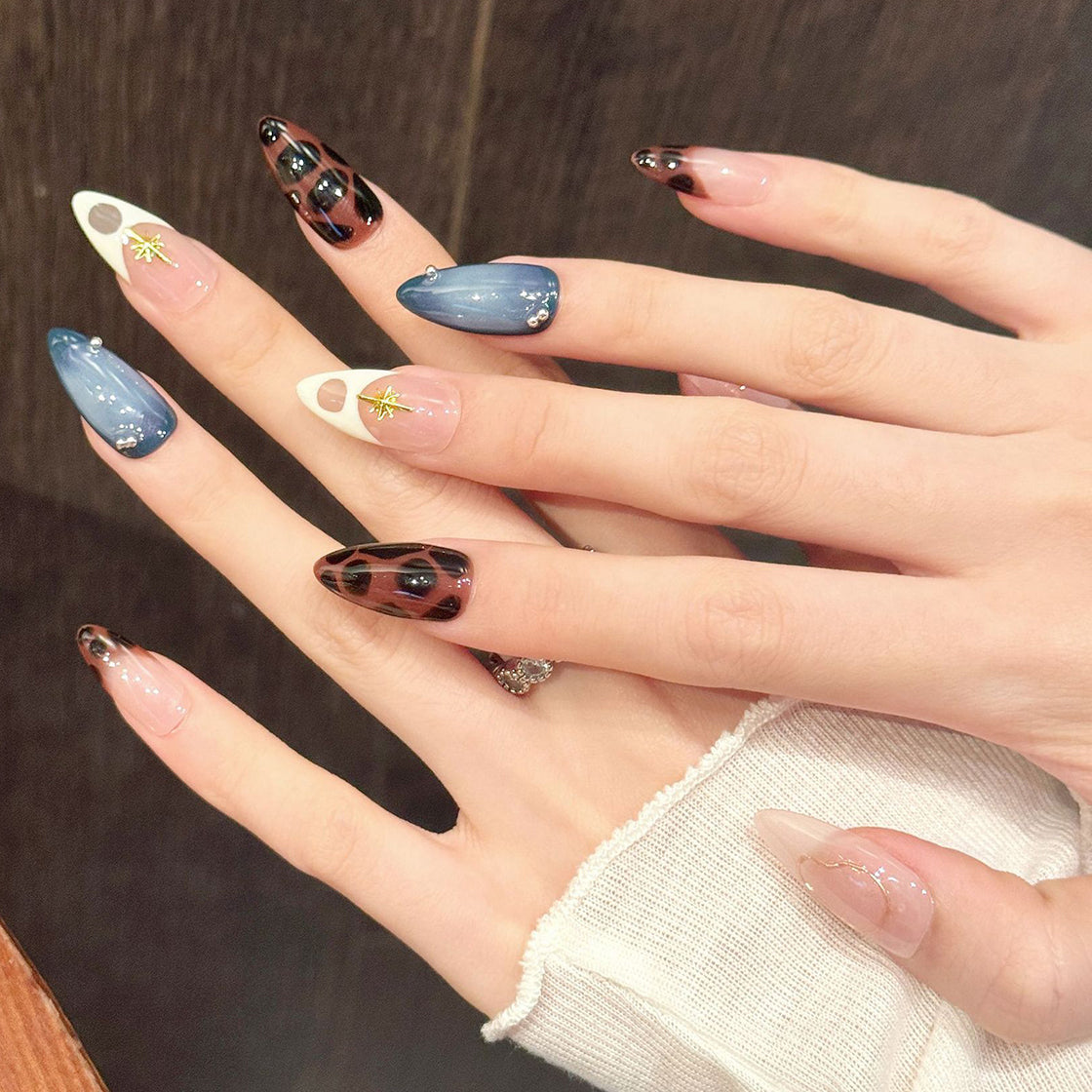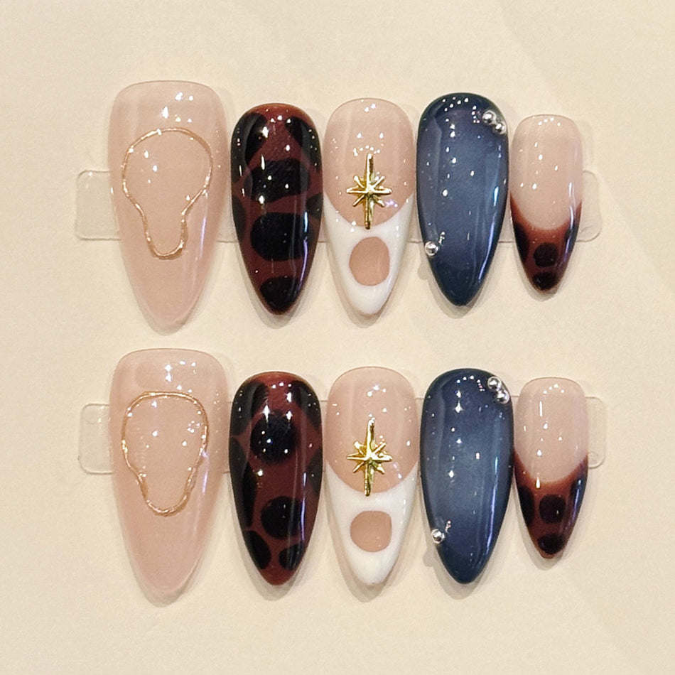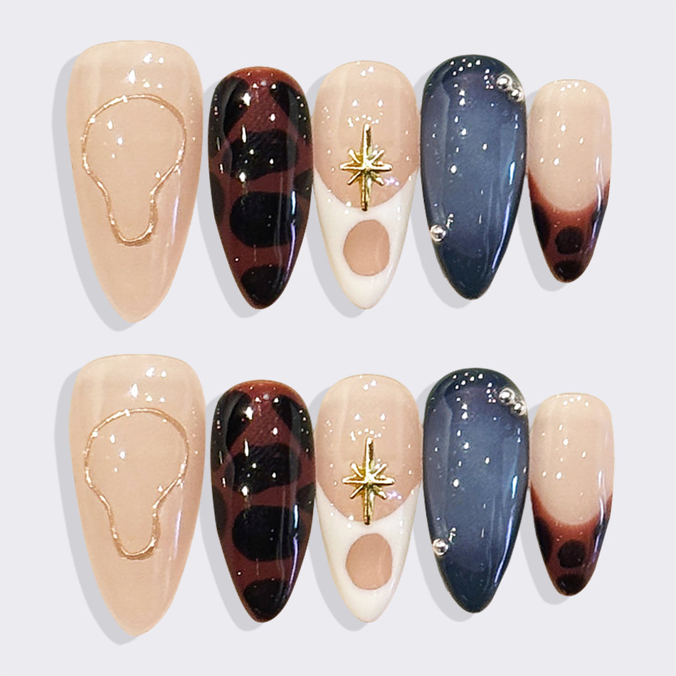 Mysterious and chic, these press-on nails blend deep night skies with soft nude tones, featuring starry textures, metallic outlines, and bold leopard-inspired patterns. Accented with gold stars and subtle sparkle, they evoke a dreamy, celestial elegance—perfect for those who love cosmic glamour.