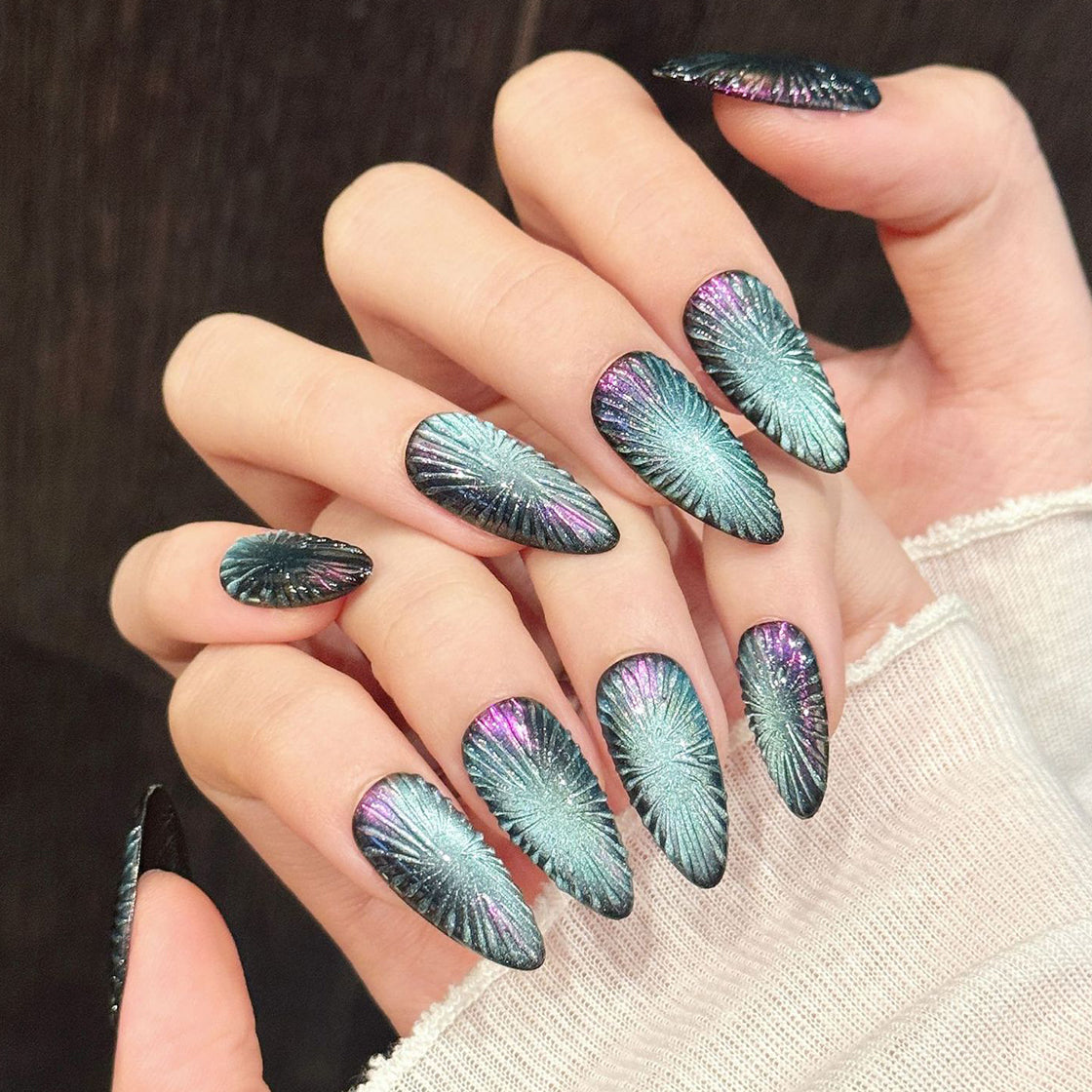 Elegant and mesmerizing, these press-on nails feature a radiant galaxy-inspired design with shimmering iridescent hues and delicate starburst patterns. Each nail captures the magic of the cosmos, blending deep blues, purples, and sparkling silver for a dreamy, ethereal look that turns every glance into a celestial moment.
