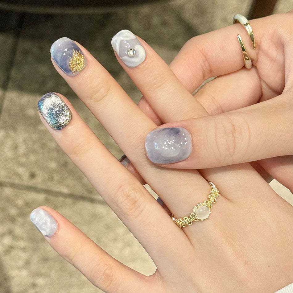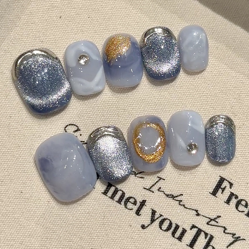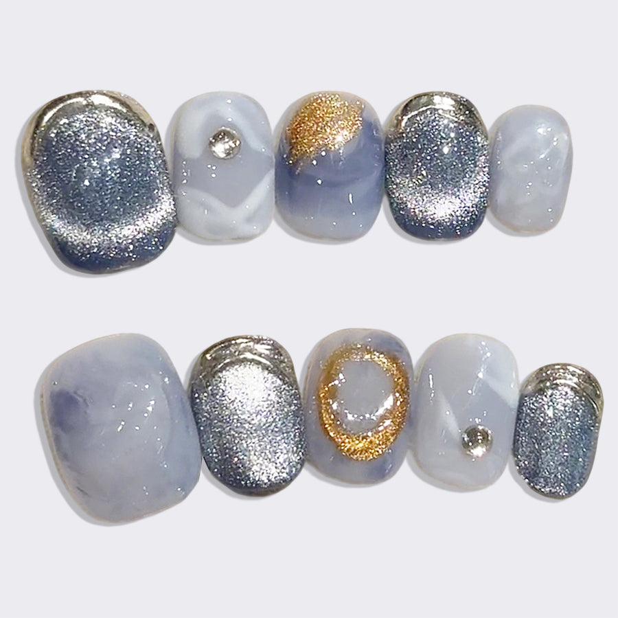 Inspired by the depths of the sea and starlit nights, these press-on nails feature cool blue marbling with shimmering silver glitter and golden accents. Each nail captures a tranquil, ethereal glow—like moonlight dancing on water—perfect for those who love serene, celestial elegance.