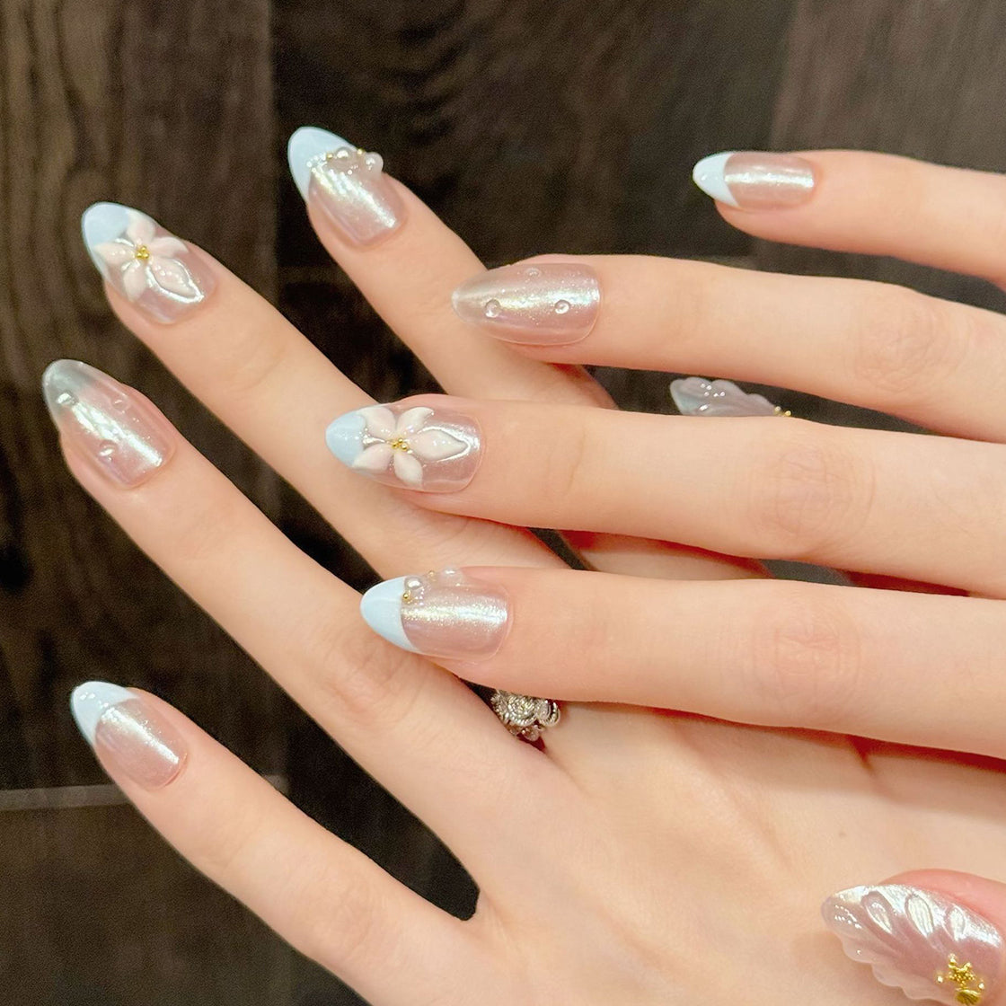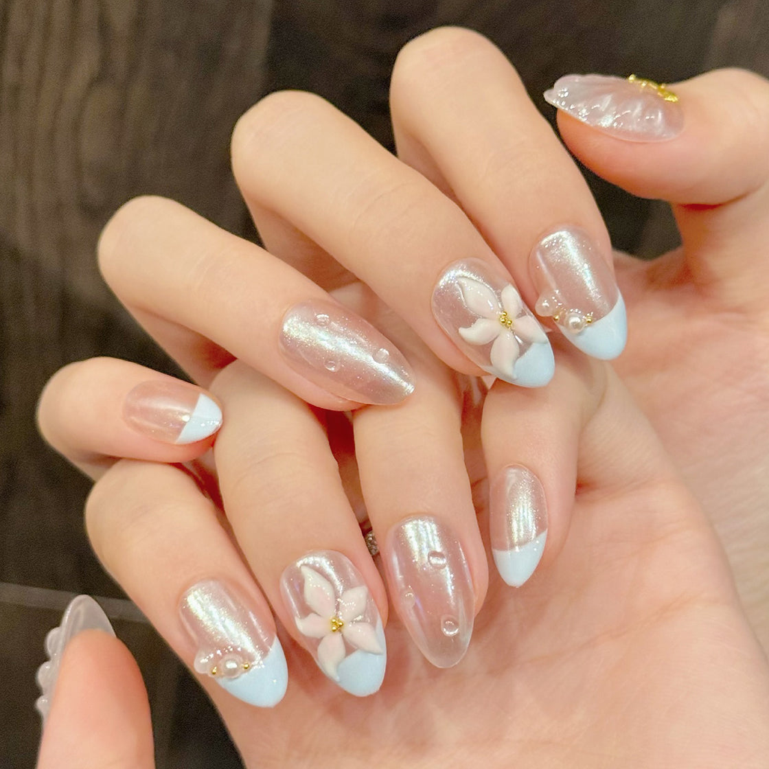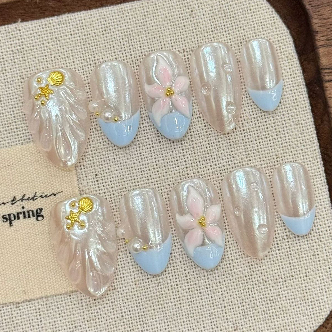 Elegant and ethereal, these press-on nails feature a delicate iridescent finish with soft blue tips, 3D seashell textures, and tiny floral accents. Adorned with pearls and gold details, they capture the gentle beauty of ocean waves—perfect for a serene, feminine look.