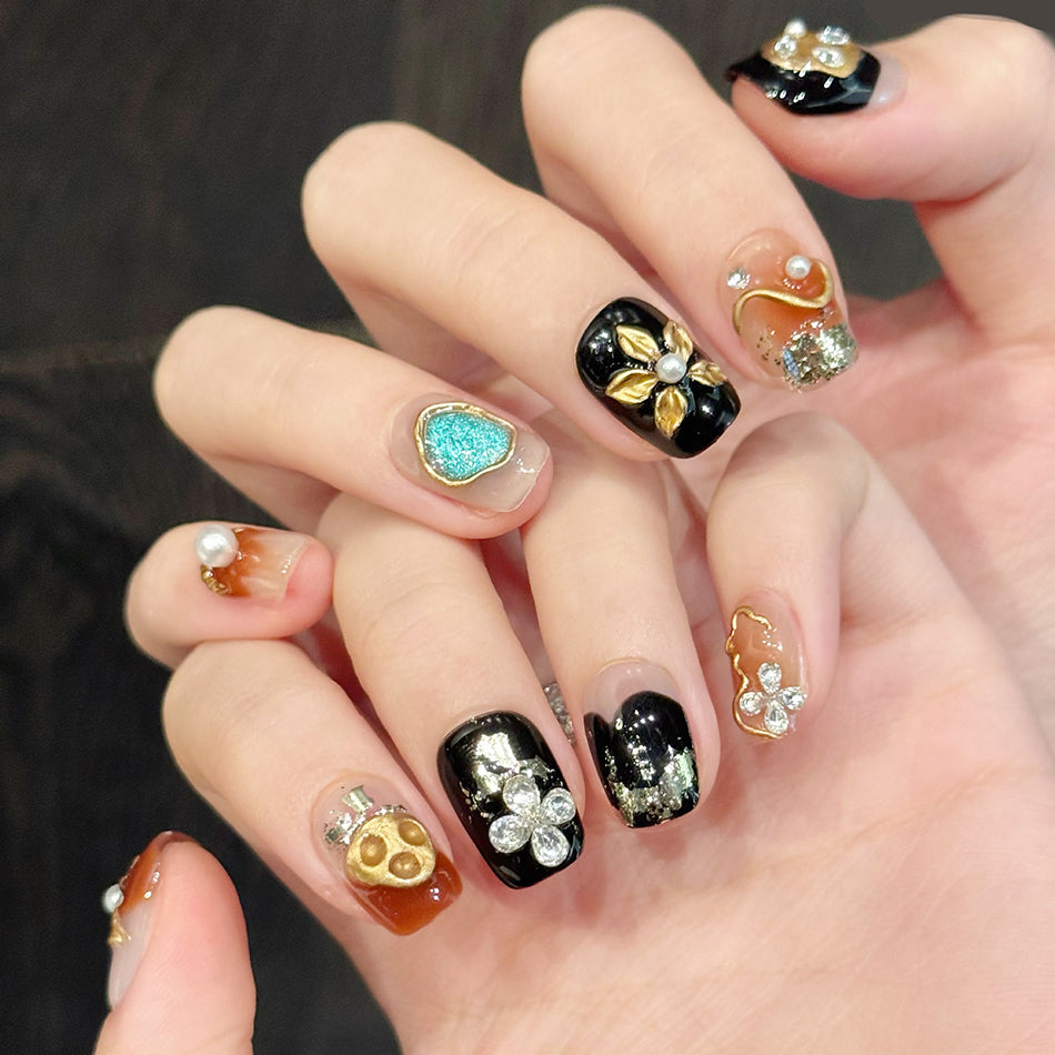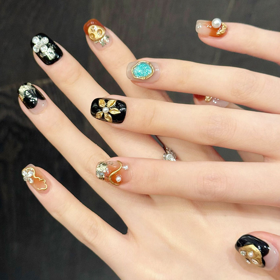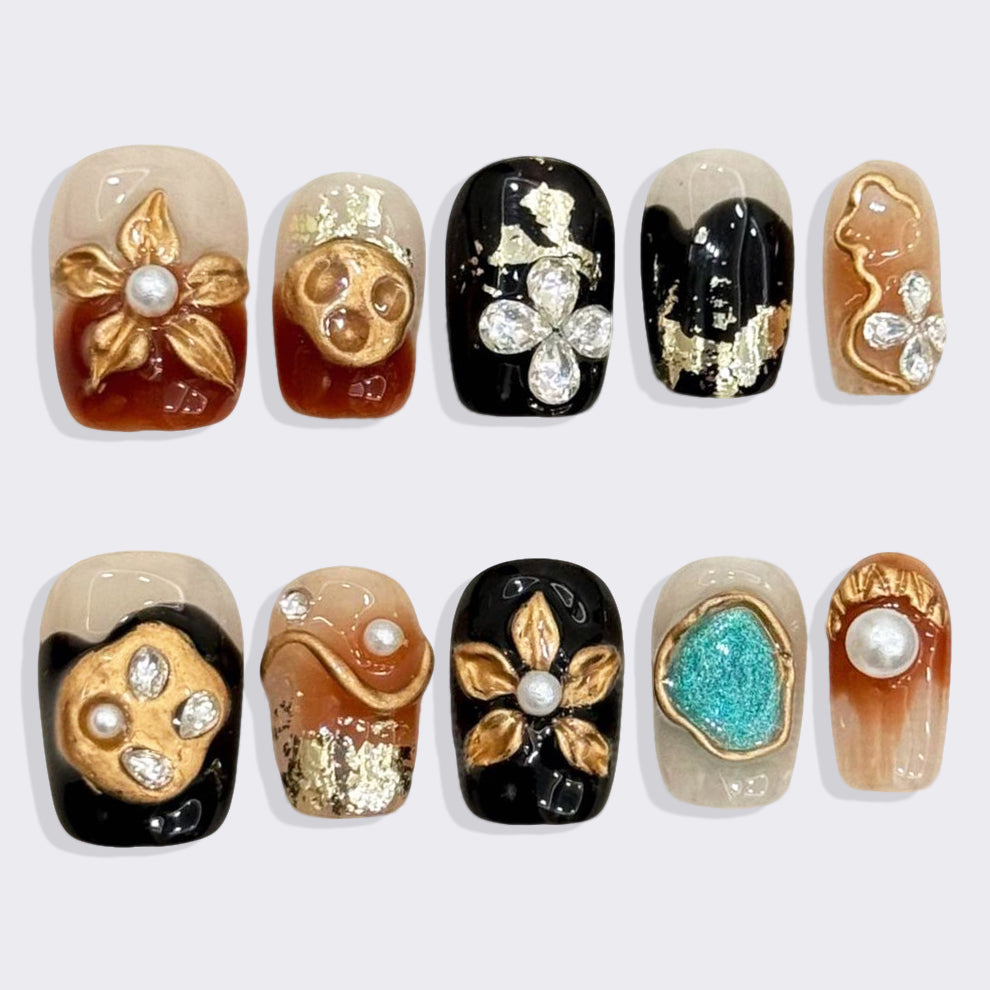 Elegant nails blending deep black, warm amber, and rich gold with 3D floral designs, pearls, and crystal accents. A luxurious, artistic design that exudes vintage glamour—perfect for those who love bold, refined elegance with a touch of drama.