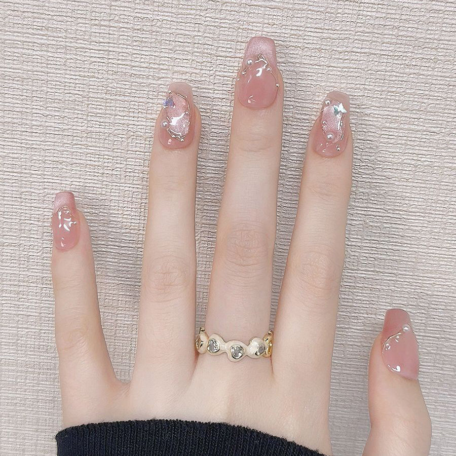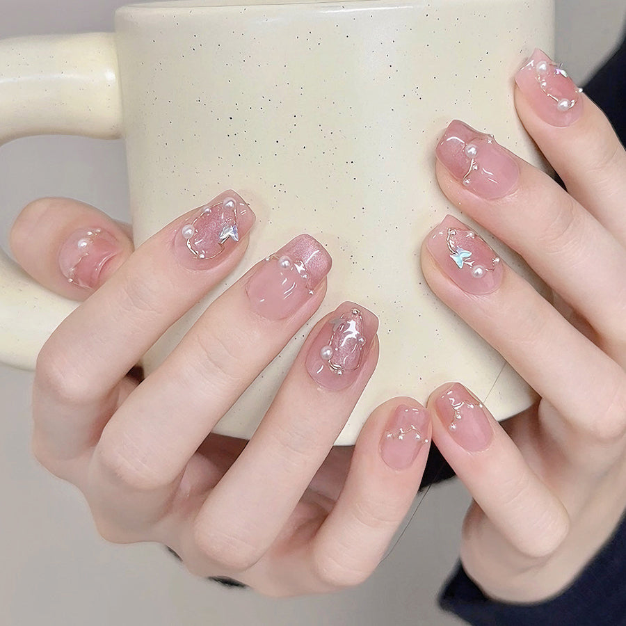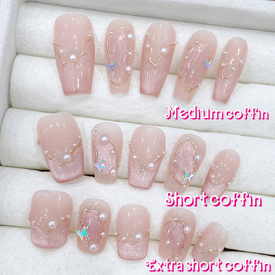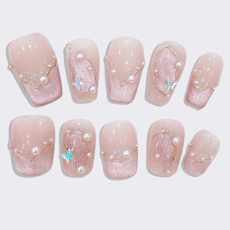 Elegant blush pink nails adorned with delicate gold lines, shimmering pearls, and iridescent butterflies. A soft gradient glimmer meets romantic details for a dreamy, feminine look that sparkles with grace and charm.