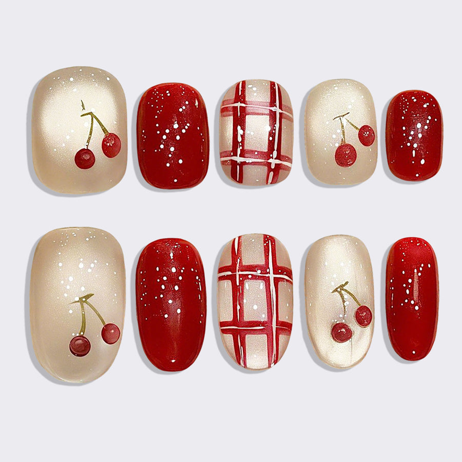 Luscious cherry details grace a shimmering Champagne base, paired with bold red nails and elegant plaid accents. This charming design blends sweet fruit motifs with modern flair, creating a stylish and eye-catching look that radiates warmth and elegance.