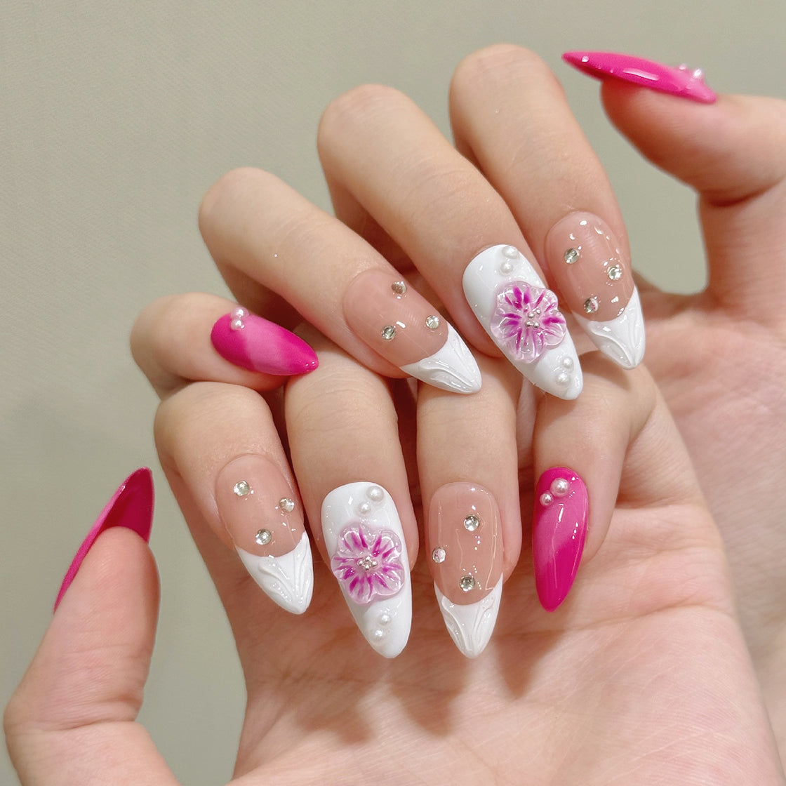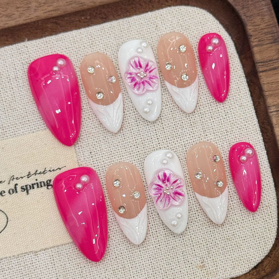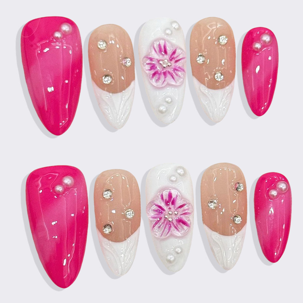 A delicate fusion of vibrant pink, soft nude, and elegant white with hand-crafted floral art, pearls, and sparkling rhinestones. This set radiates feminine charm and sweet sophistication—perfect for those who love romantic, dreamy elegance.