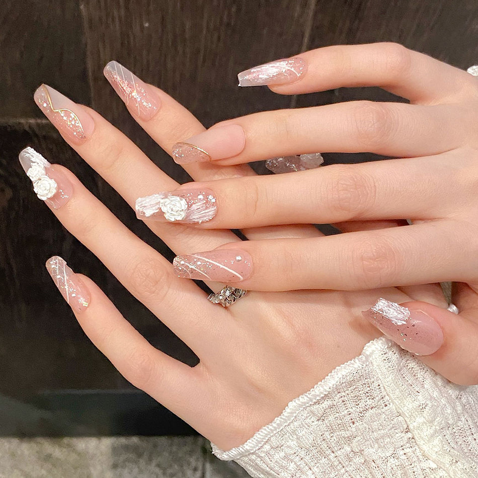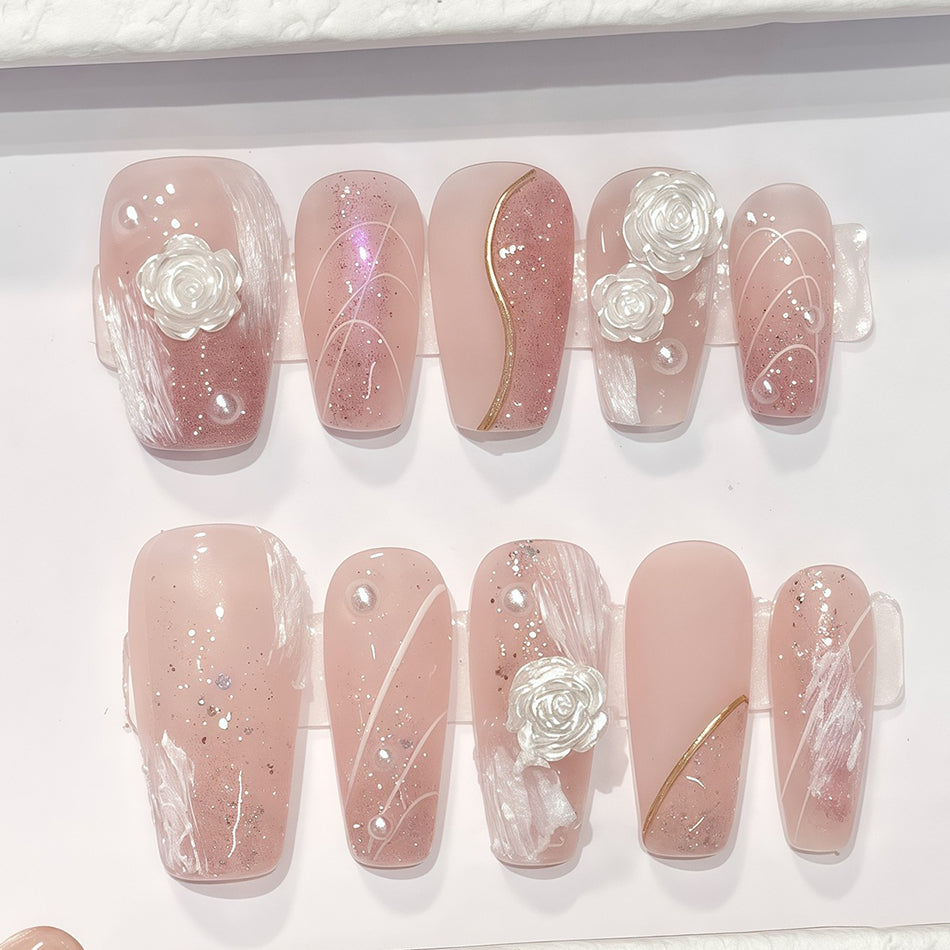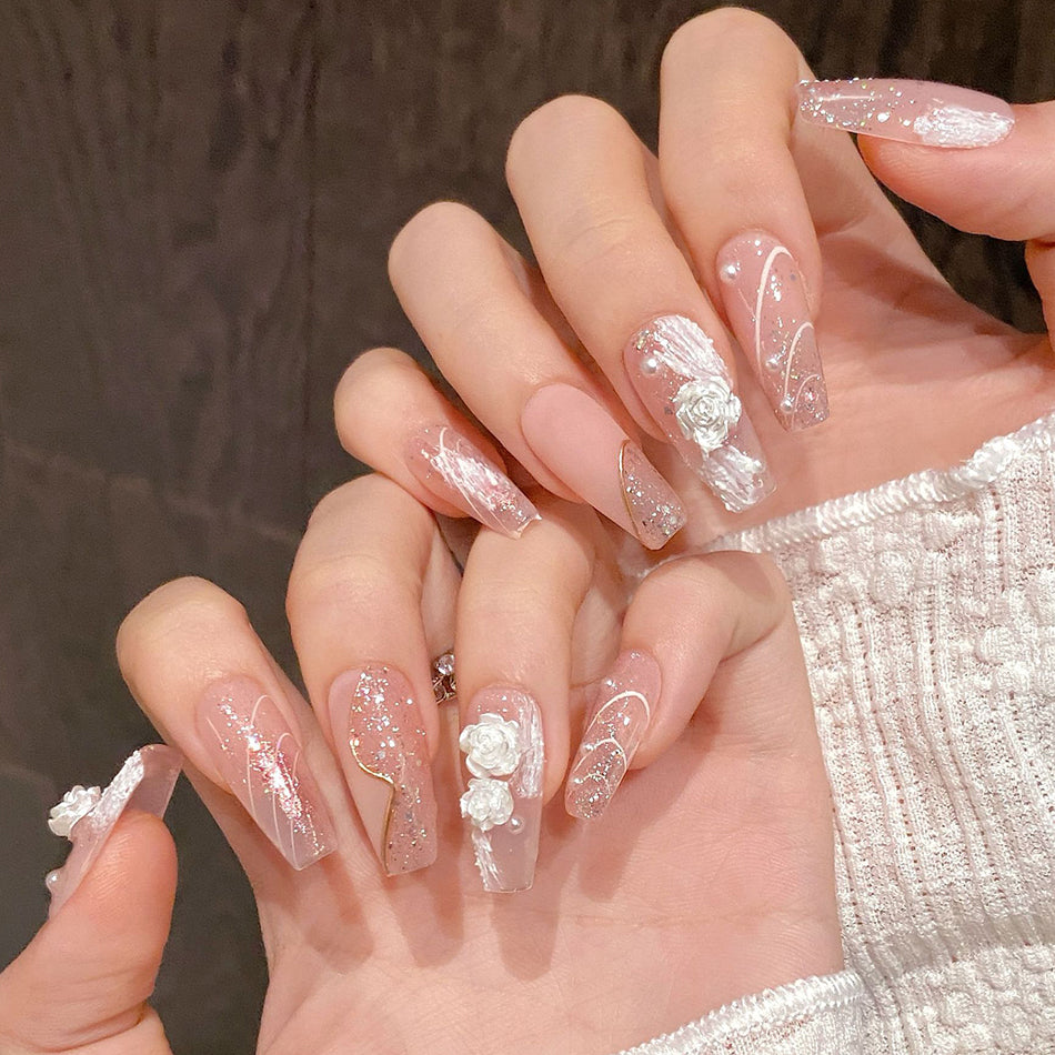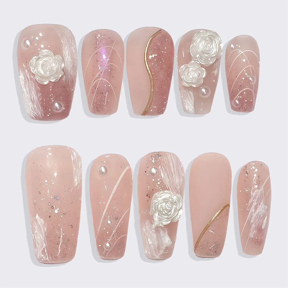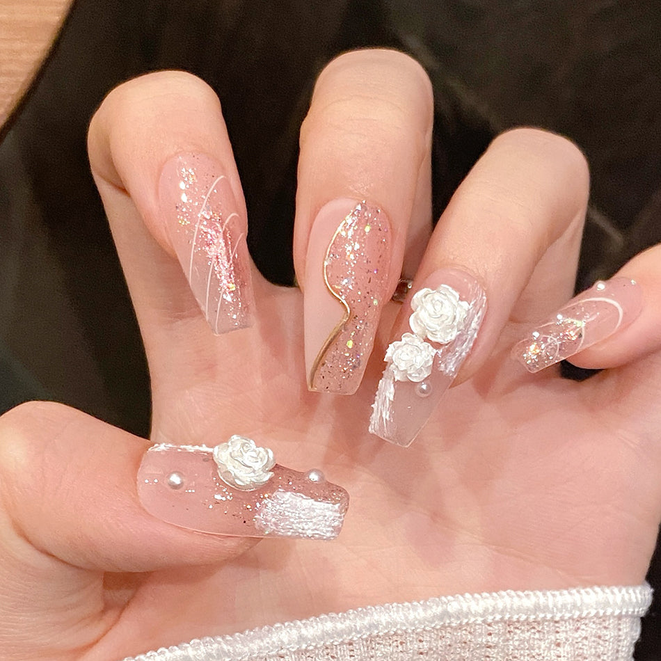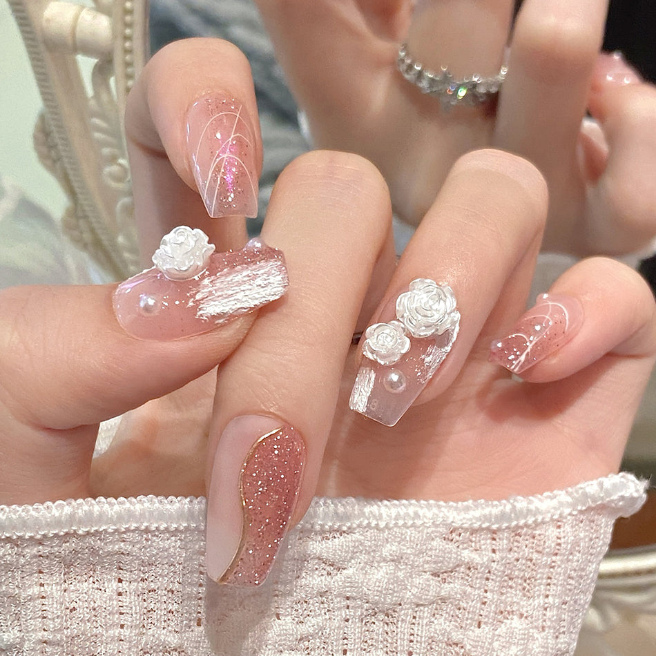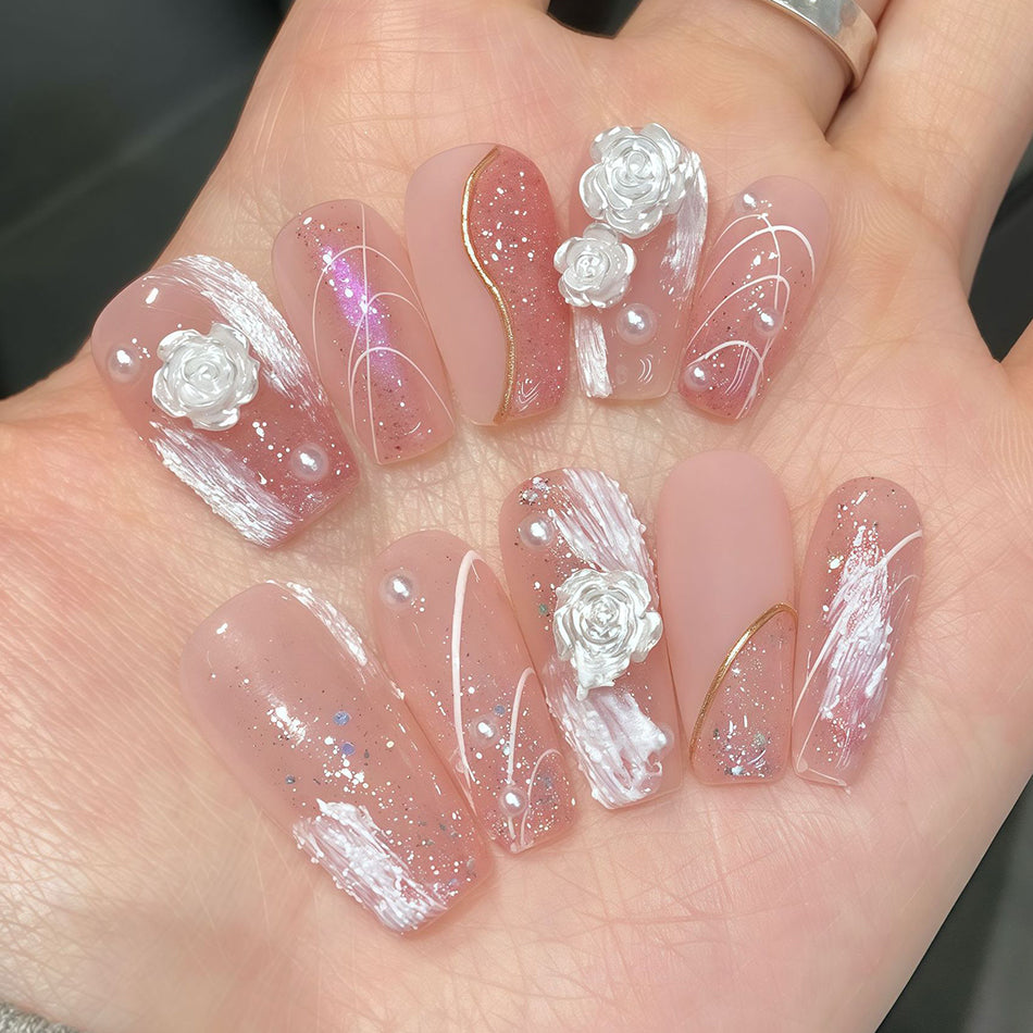 Delicate blush tones meet soft white roses and shimmering pearls for a look of timeless romance. These elegant press-on nails blend dreamy textures with subtle sparkle—perfect for adding a touch of gentle luxury to any occasion.