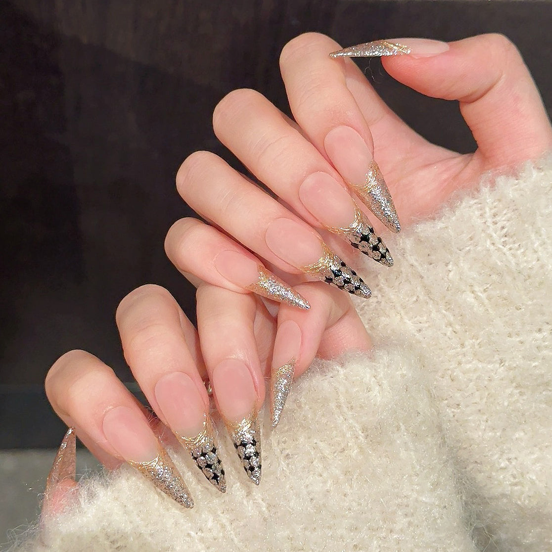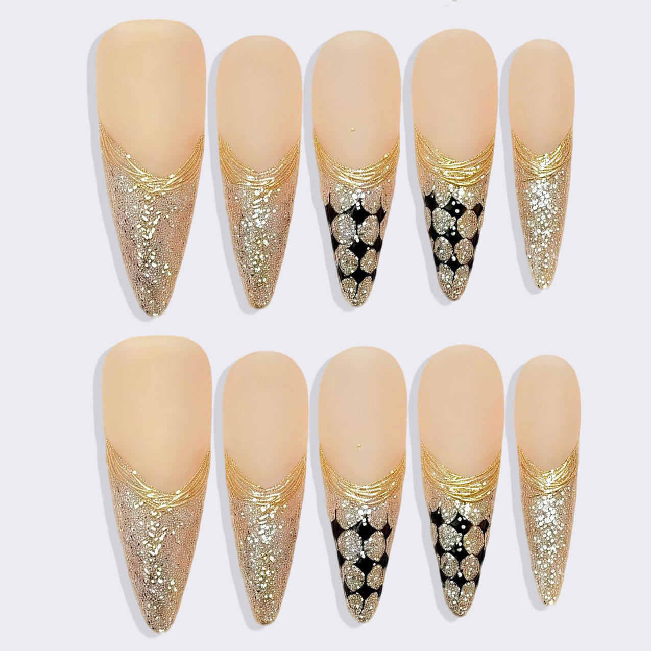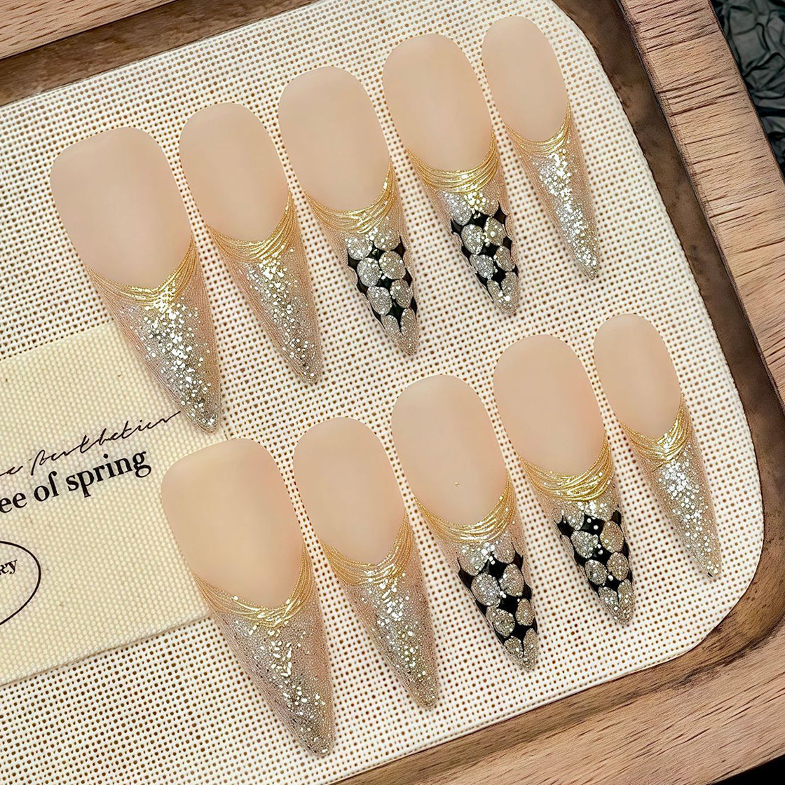 Elegant nude nails with a luxurious gold glitter tip and intricate layered detailing, accented by shimmering black polka dots. This refined design blends sophistication with bold sparkle—perfect for elevating any look with timeless glamour.