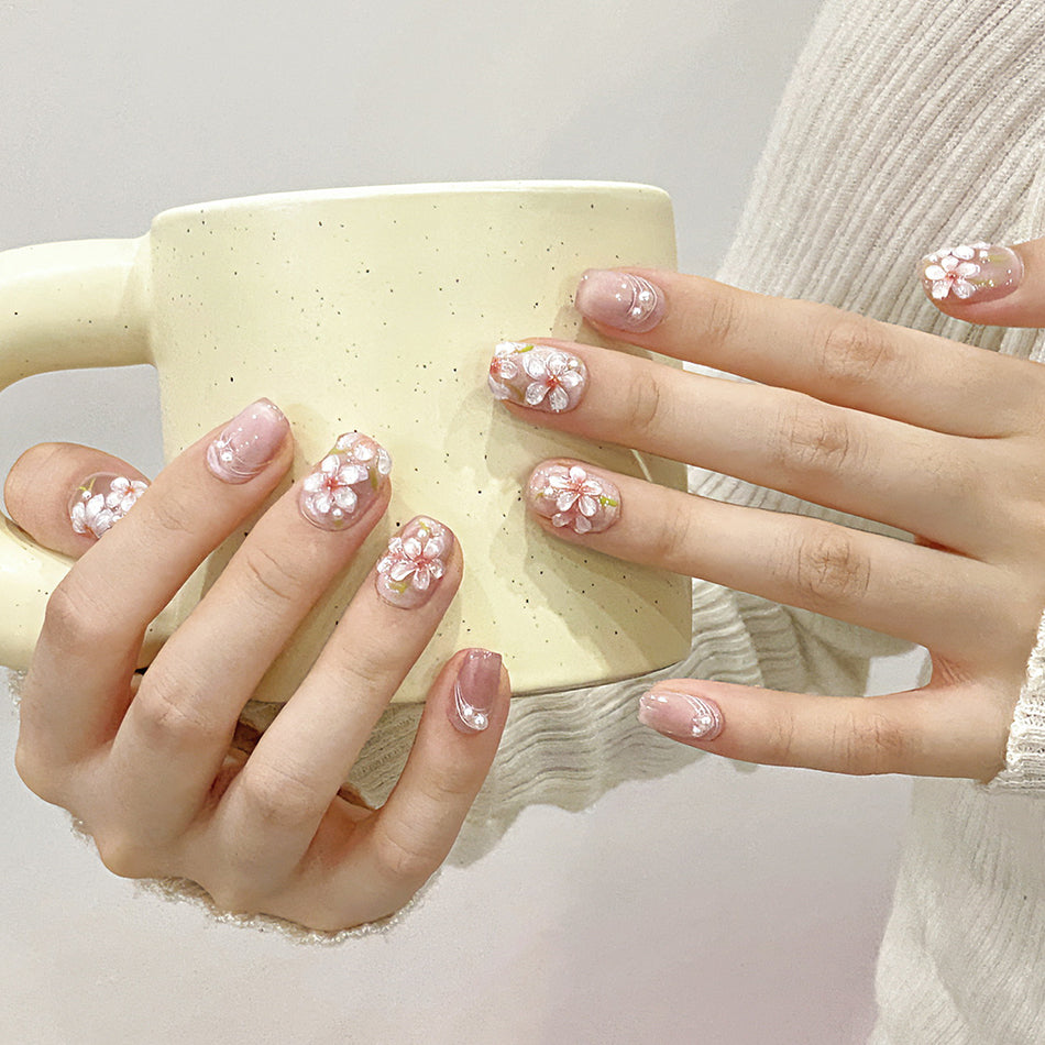 Delicate pink nails adorned with lifelike cherry blossoms and tiny pearls, capturing the soft beauty of spring. Each petal is handcrafted with gentle detail, evoking a sense of romance and renewal—perfect for those who love delicate, floral elegance.