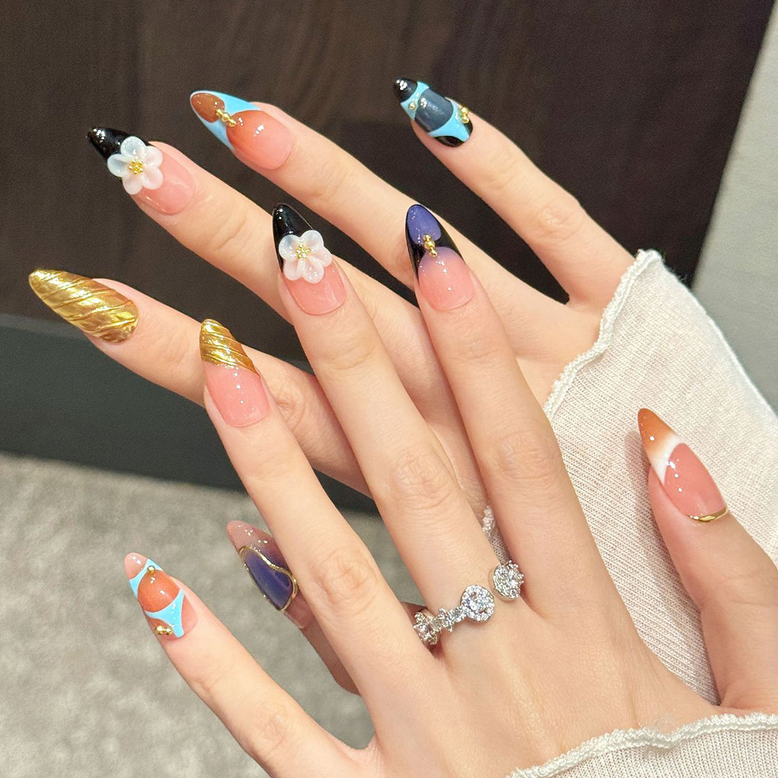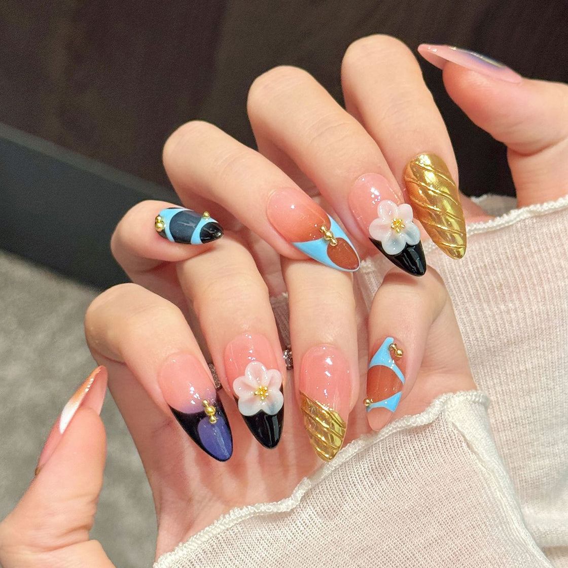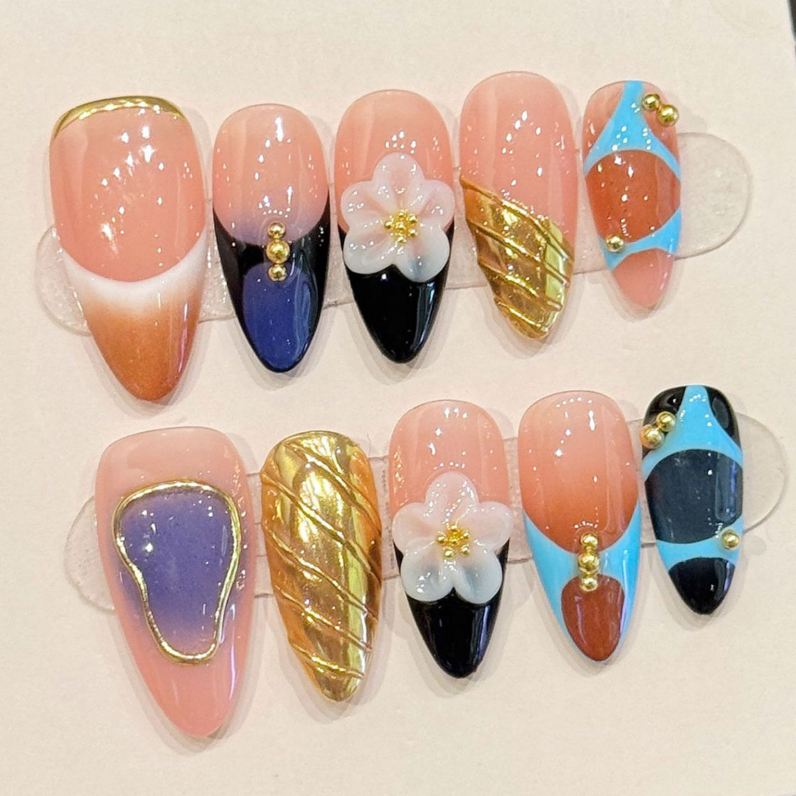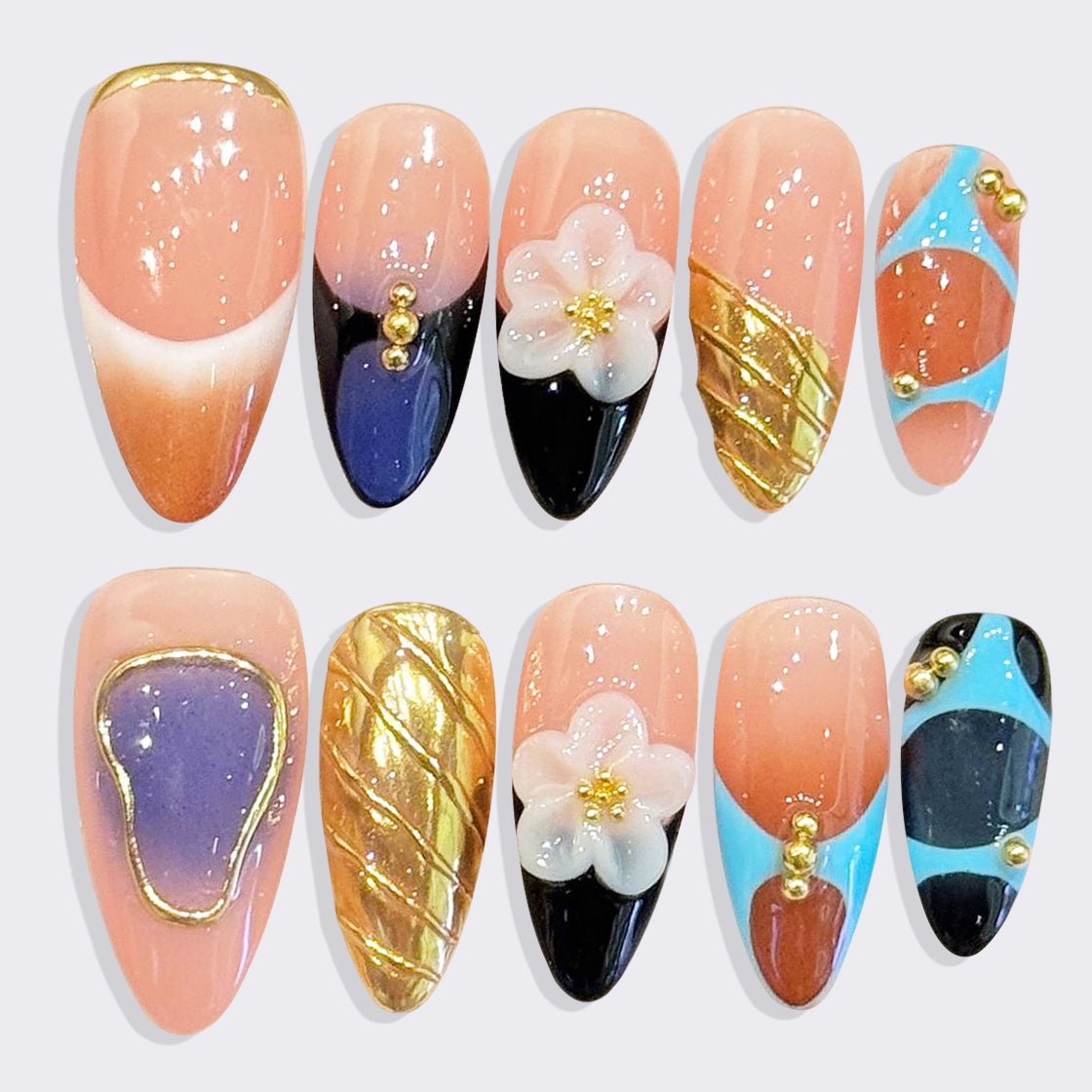A delicate fusion of soft peach hues, elegant black tips, and shimmering gold accents. Adorned with lifelike cherry blossoms and artistic geometric designs, these press-on nails exude refined beauty and modern charm—perfect for a touch of feminine sophistication.