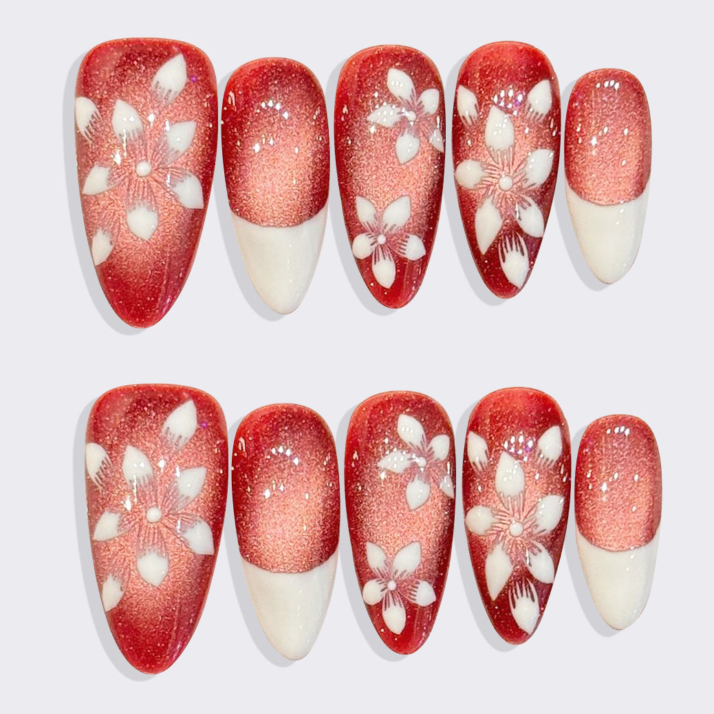 Rich red nails with delicate white cherry blossom patterns and a soft French tip. This elegant design captures the beauty of spring in a bold, shimmering finish—perfect for a romantic yet striking look.