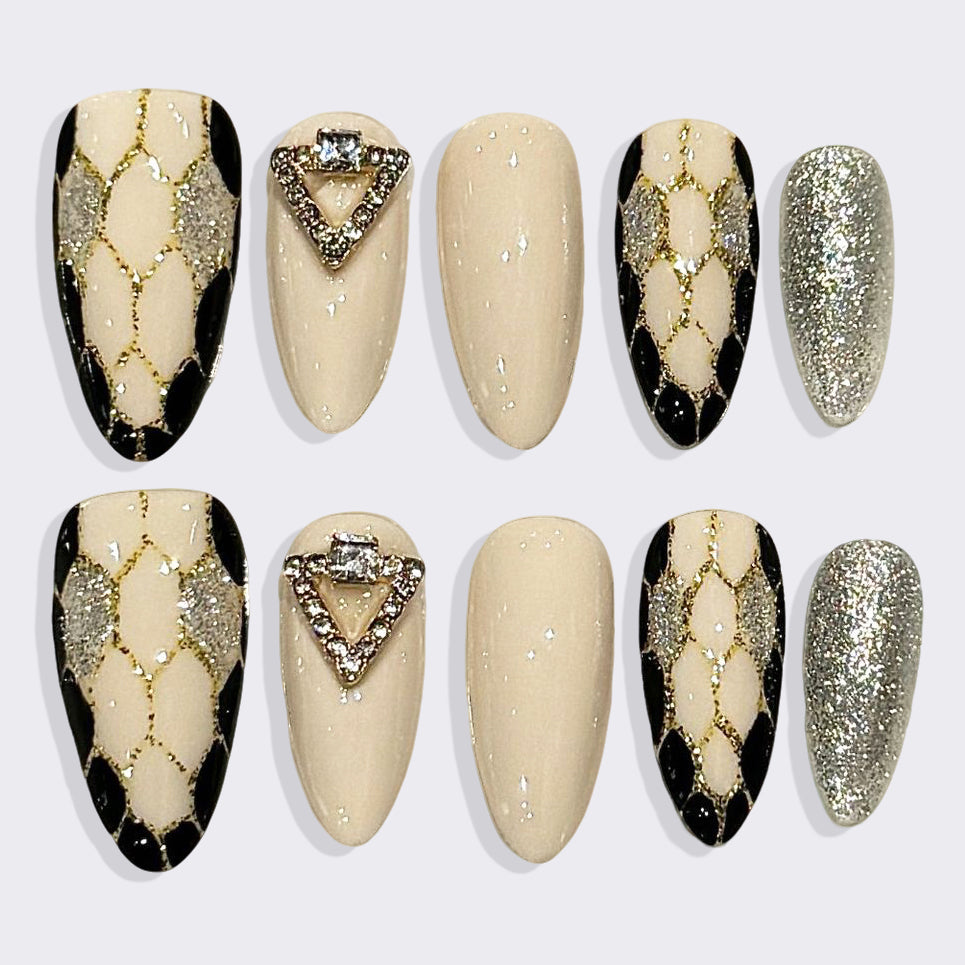 Bold and refined, these press-on nails feature a striking black-and-white snakeskin texture accented with gleaming gold details. The luxurious reptilian pattern exudes confidence and modern sophistication—perfect for those who dare to blend edge with elegance.