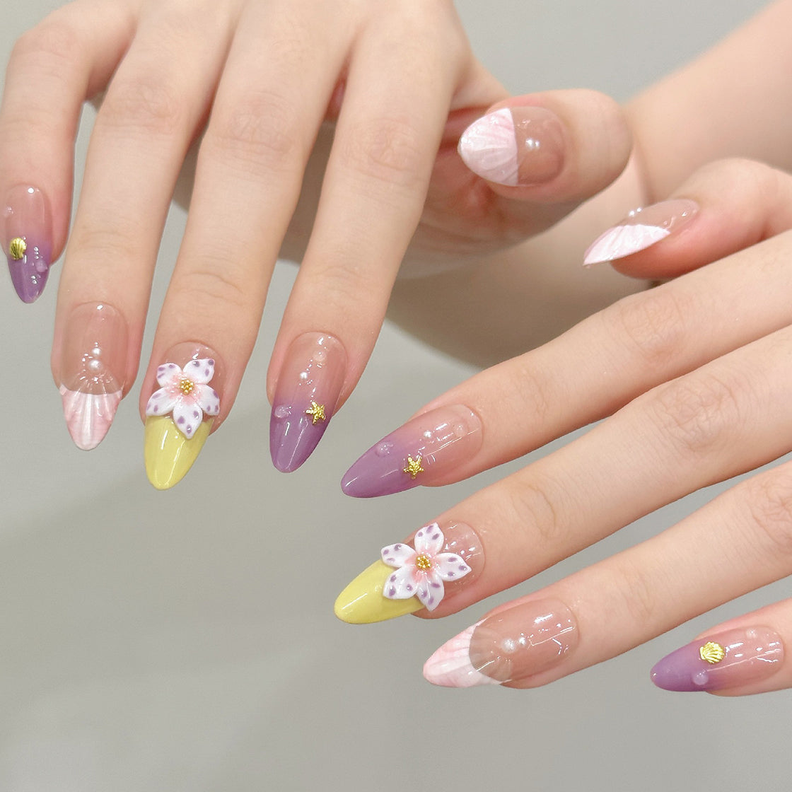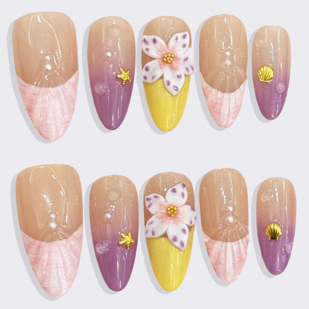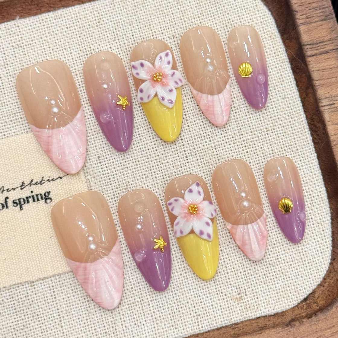 Elegant ombre nails inspired by the ocean’s beauty, featuring delicate shell patterns, golden starfish, and soft floral accents. Each design blends pastel hues with pearl details for a dreamy, feminine look—perfect for those who love nature’s grace on their fingertips.