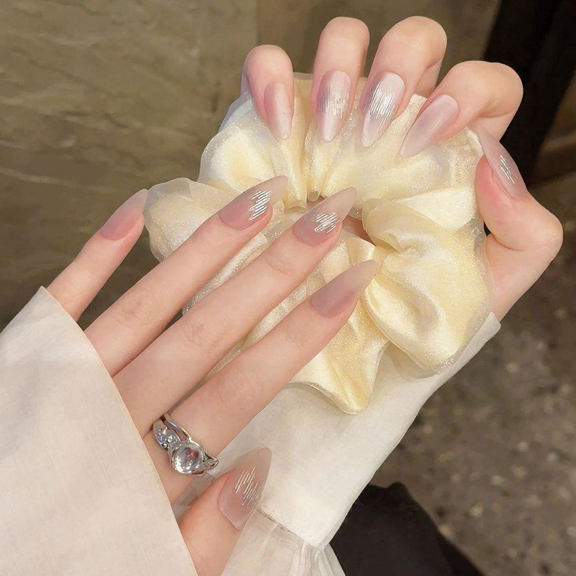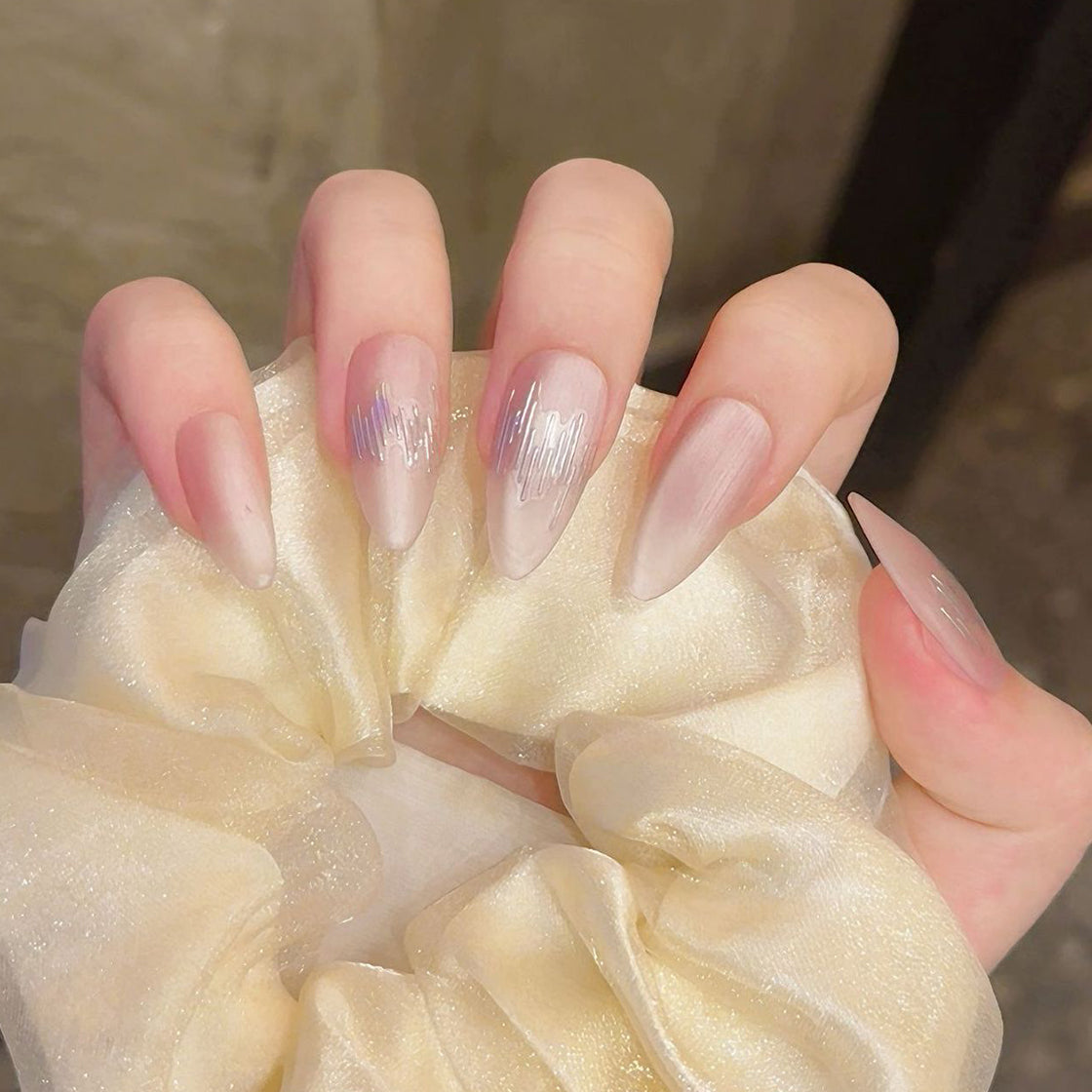 Elegant nude-toned press-on nails with a delicate iridescent finish and shimmering vertical streaks that catch the light like morning dew. Subtle, sophisticated, and effortlessly chic—perfect for adding a luminous glow to any look.