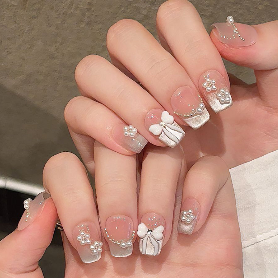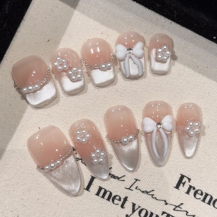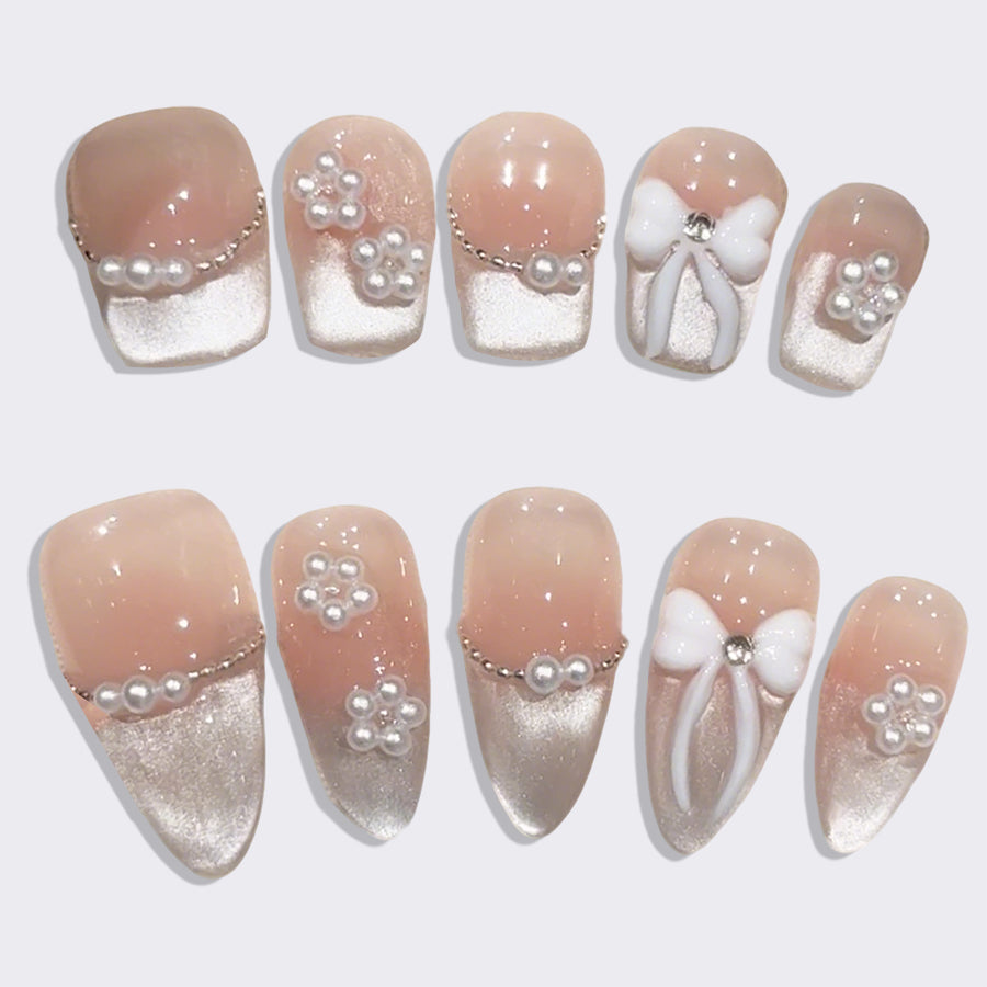 Elegant press-on nails with a soft ombre finish, adorned with delicate pearls, floral clusters, and a sweet white bow. Each nail exudes timeless femininity and gentle charm—perfect for adding a touch of vintage elegance to your style.