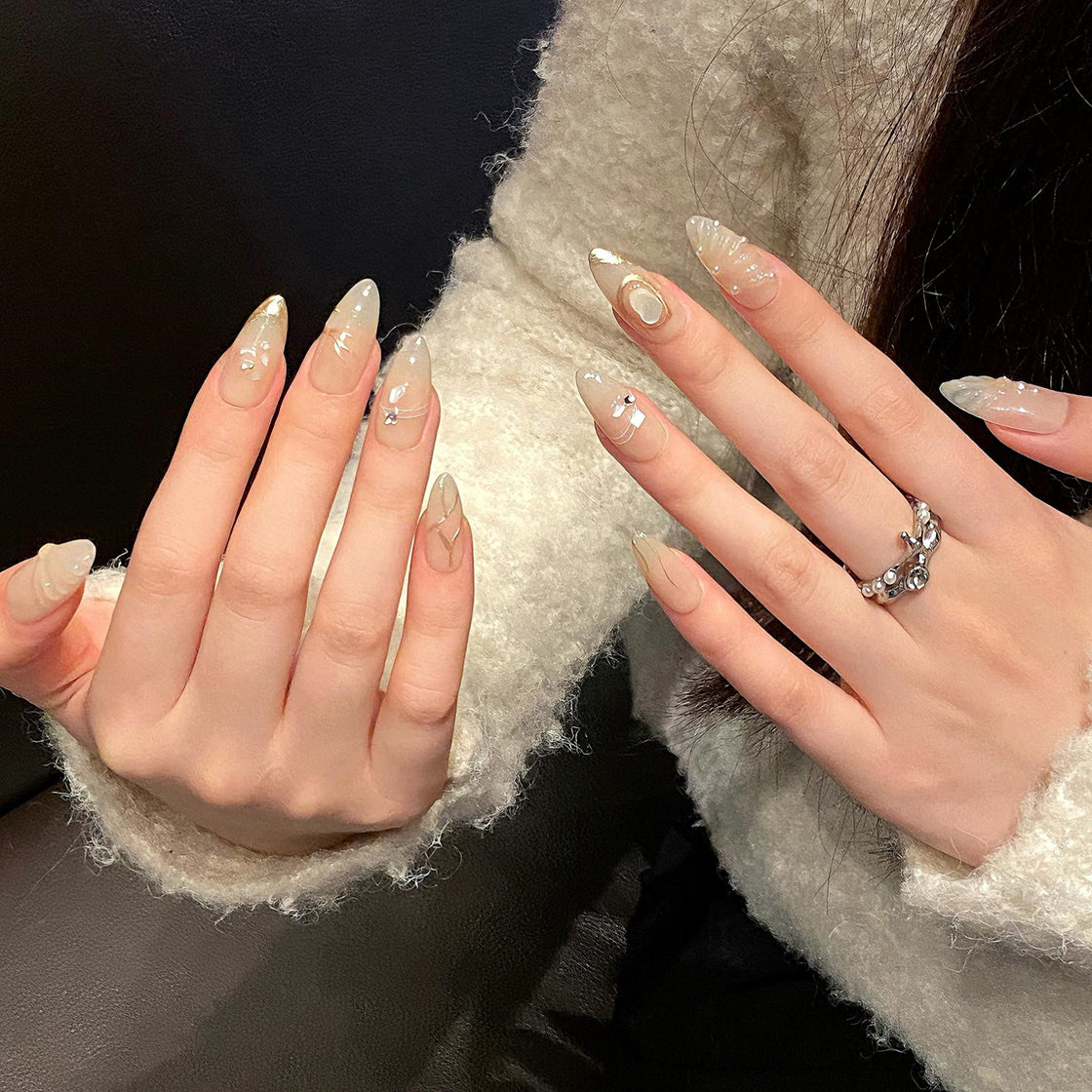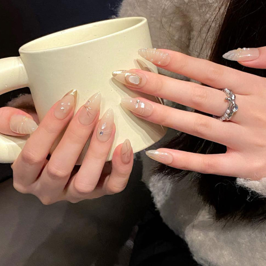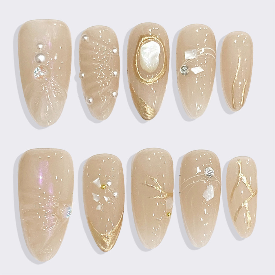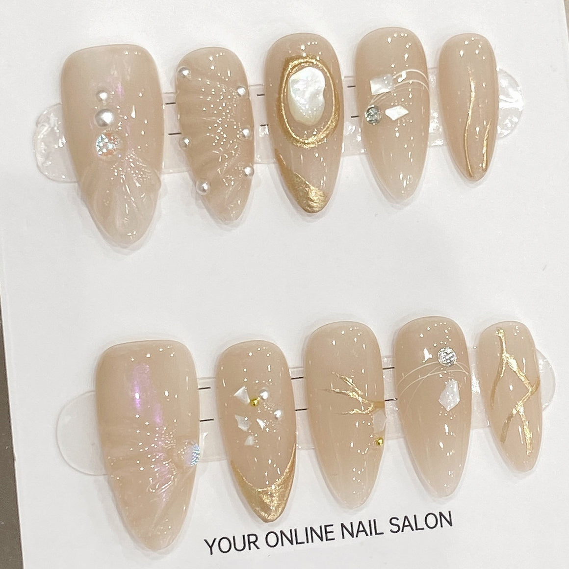 Elegant and refined, these press-on nails feature a soft nude base with delicate gold accents, shimmering pearls, and iridescent details. Each nail is adorned with artistic textures—crystals, fine lines, and subtle sparkle—evoking natural beauty and understated luxury. Perfect for timeless, sophisticated style.