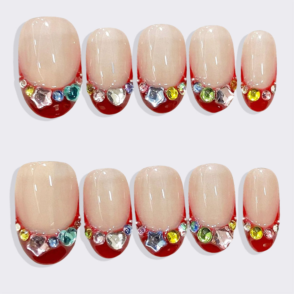 A soft nude base meets bold red tips adorned with dazzling rainbow crystals. These elegant press-on nails bring a touch of glamour and sparkle—perfect for adding a luxurious, eye-catching finish to any look with effortless style.