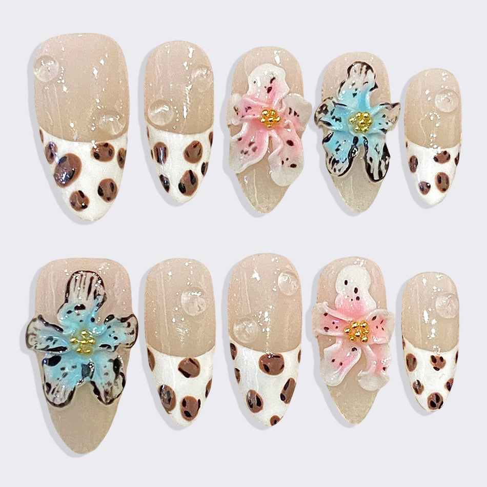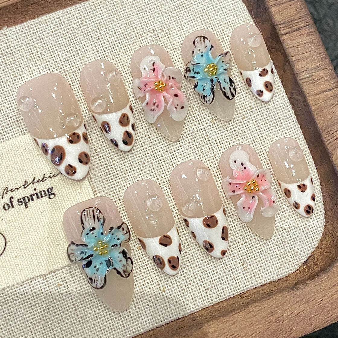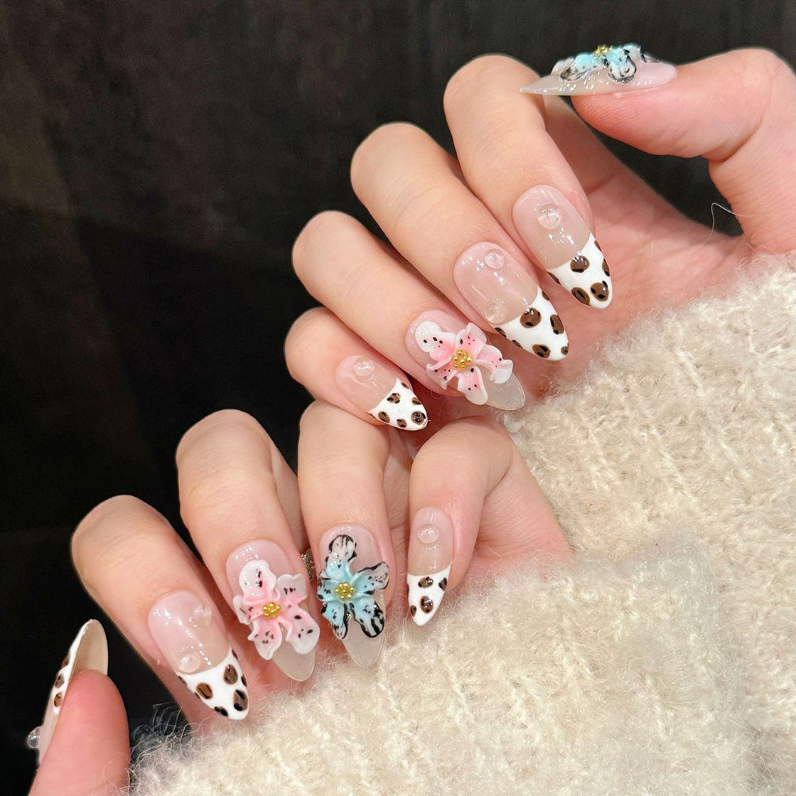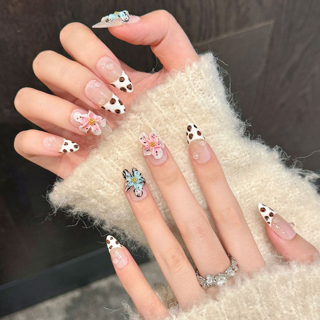 Elegant nude nails with a chic leopard-print tip and delicate 3D flowers in soft pastels, accented with golden centers and subtle glitter. This refined design blends wild flair with gentle femininity—perfect for a stylish, nature-inspired look.