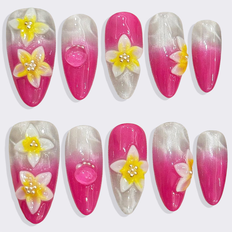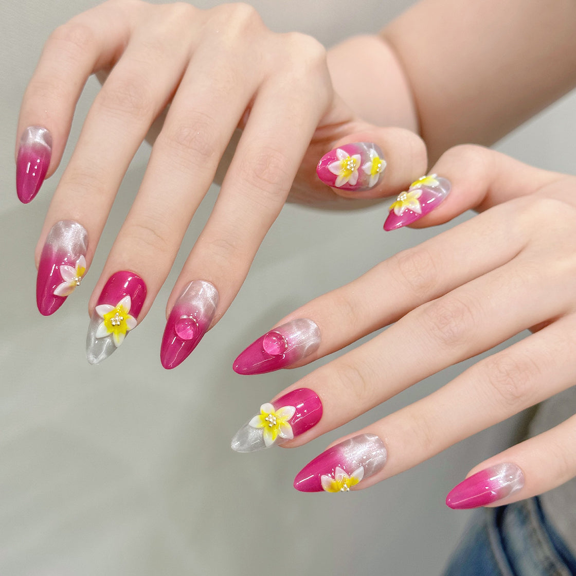 Soft ombre nails transition from sheer white to vibrant pink, adorned with delicate 3D yellow flowers and pearl centers. This romantic design captures the essence of spring—elegant, fresh, and full of gentle charm.