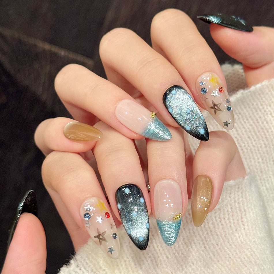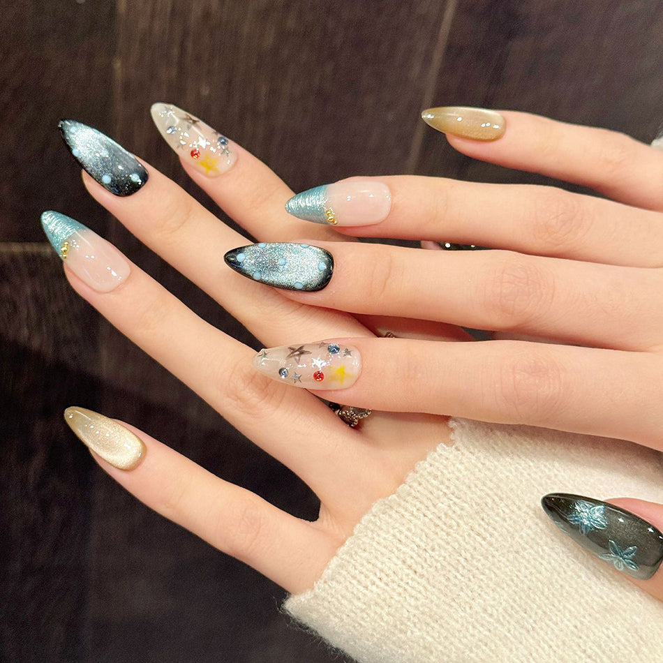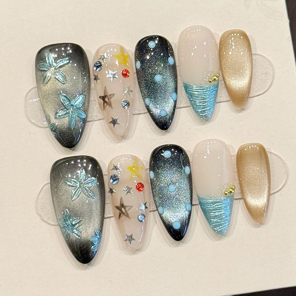 A mesmerizing blend of cosmic sparkle and oceanic serenity, these press-on nails feature starry skies, shimmering waves, and ethereal floral accents. Crafted with glittering details and dreamy gradients, they evoke the magic of a midnight seaside—elegant, bold, and deeply enchanting.