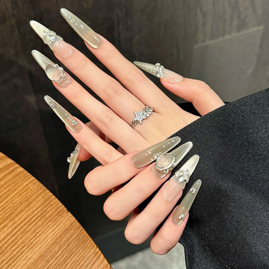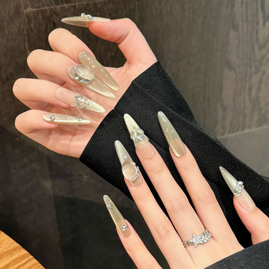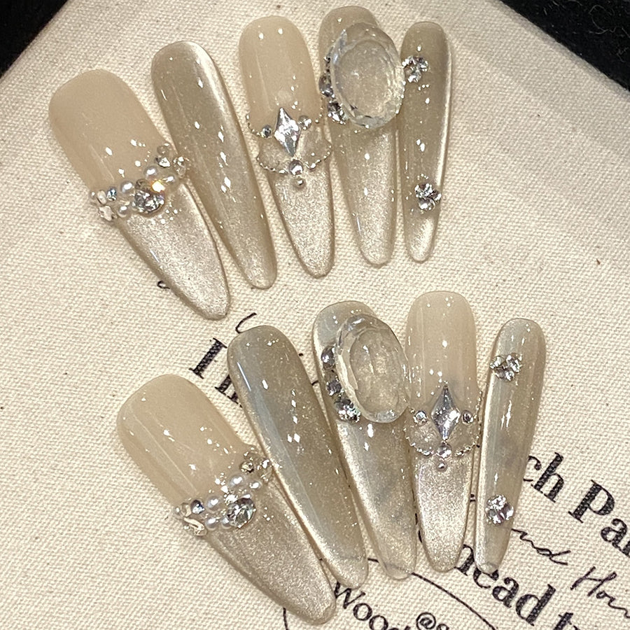 Soft nude base meets ethereal glitter and sparkling stones, like moonlight dancing on silk. Nails are adorned with elegant rhinestones , evoking dreamy elegance and quiet luxury.