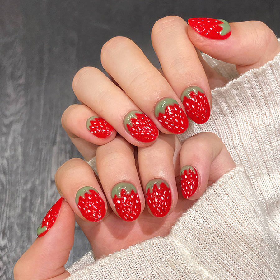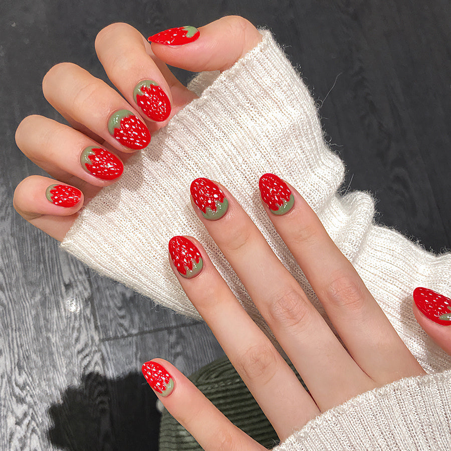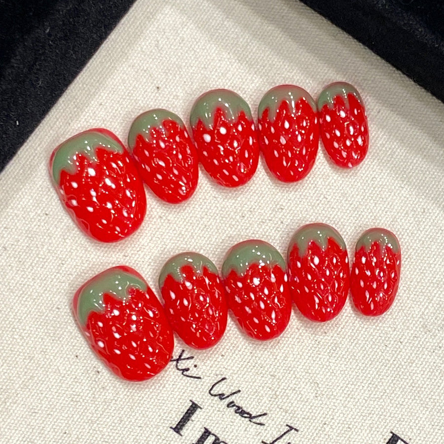 Juicy red nails with realistic strawberry texture and green tips, bursting with playful charm. A sweet, vibrant design that brings summer freshness to your fingertips—perfect for fun-loving fashionistas.