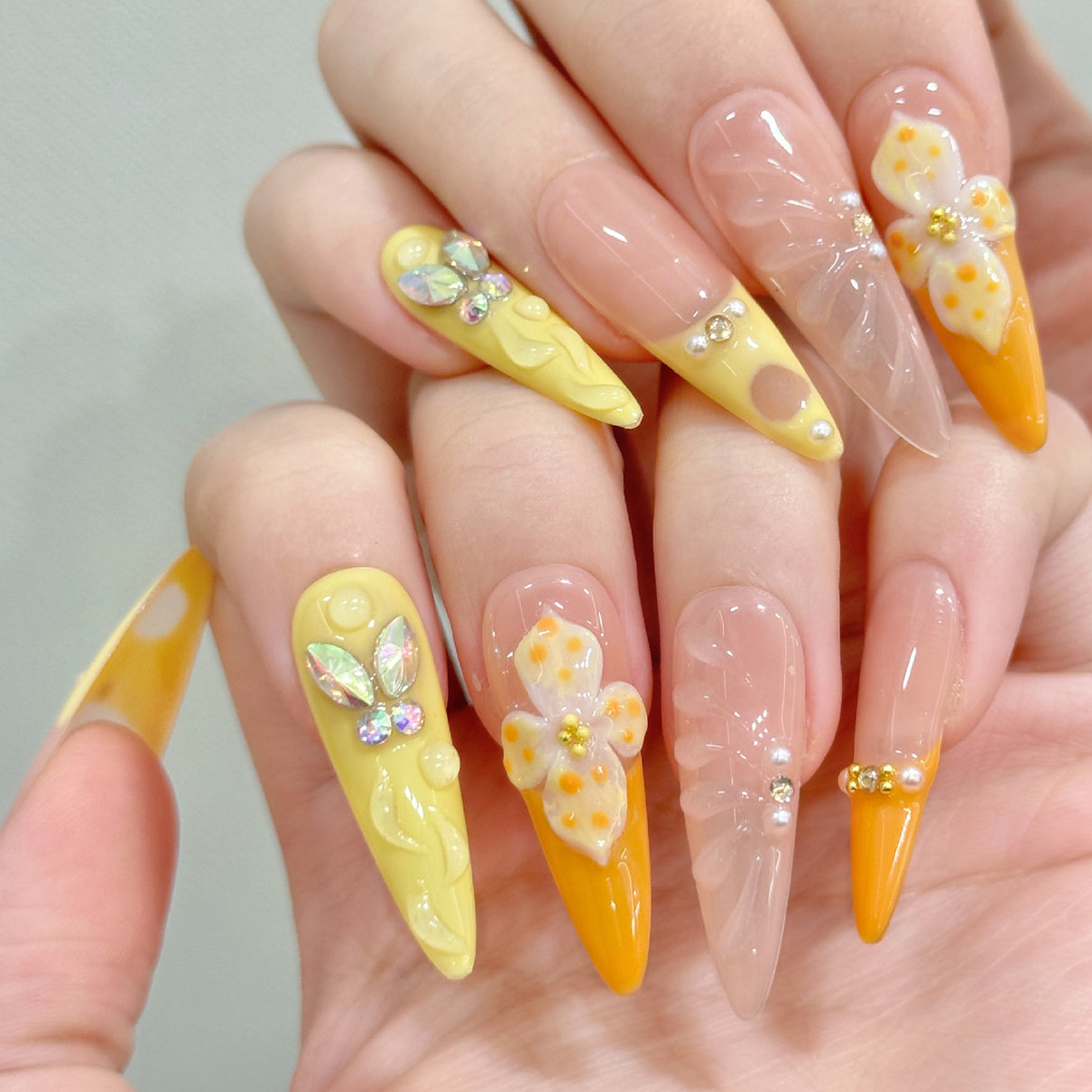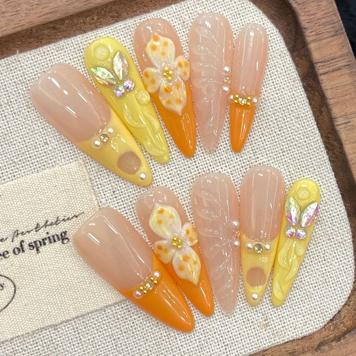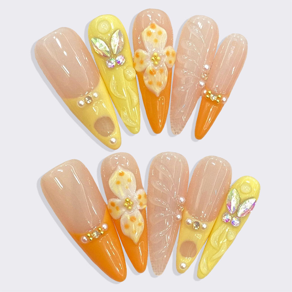 Elegant and radiant, these press-on nails blend soft peach and golden hues with delicate floral designs and sparkling accents. Each nail features handcrafted details—pearl beads, shimmering leaves, and blooming flowers—evoking the warmth of sunlight on spring blossoms. Perfect for adding a touch of gentle glamour to any look.