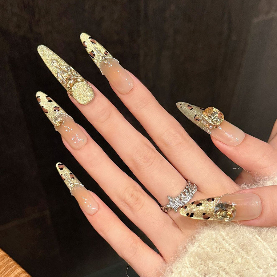 Embrace bold luxury with Sunset Gold Leopard Glam nails. Featuring sunset-inspired gold gradients, leopard print, and sparkling crystals, they blend wild charm and opulence.
