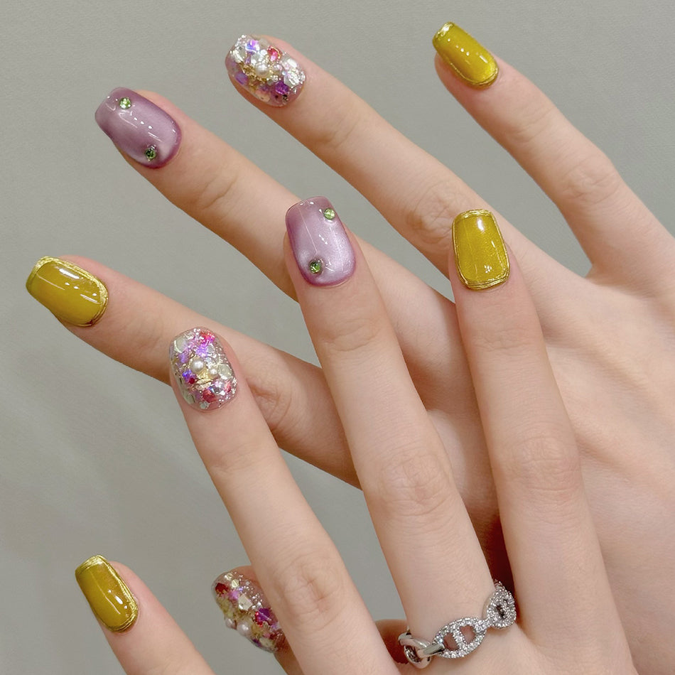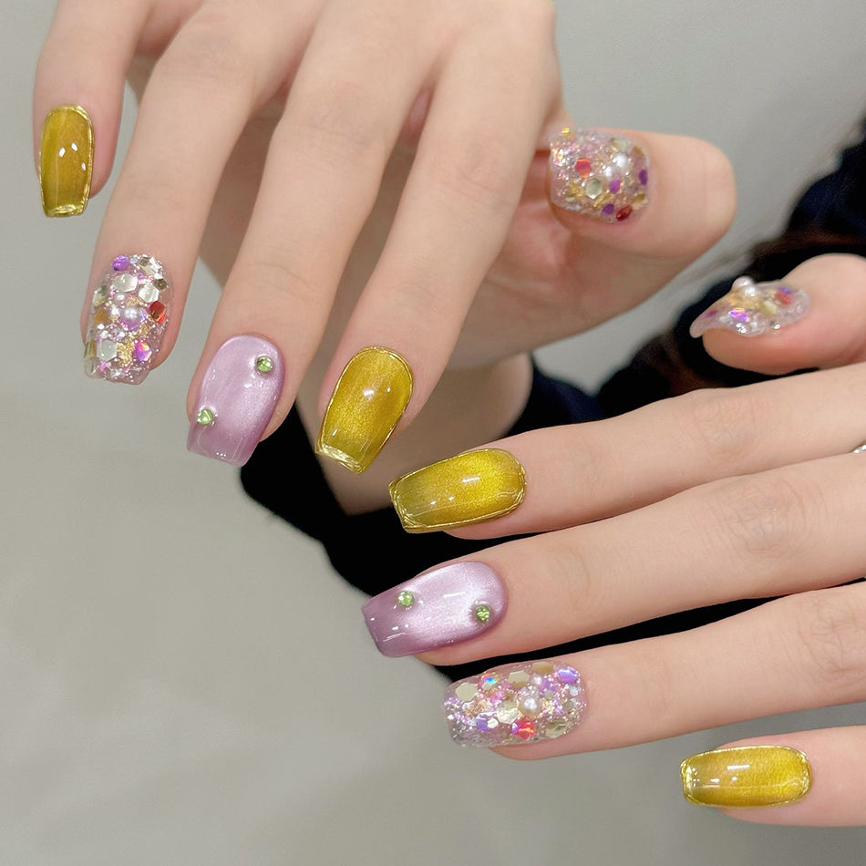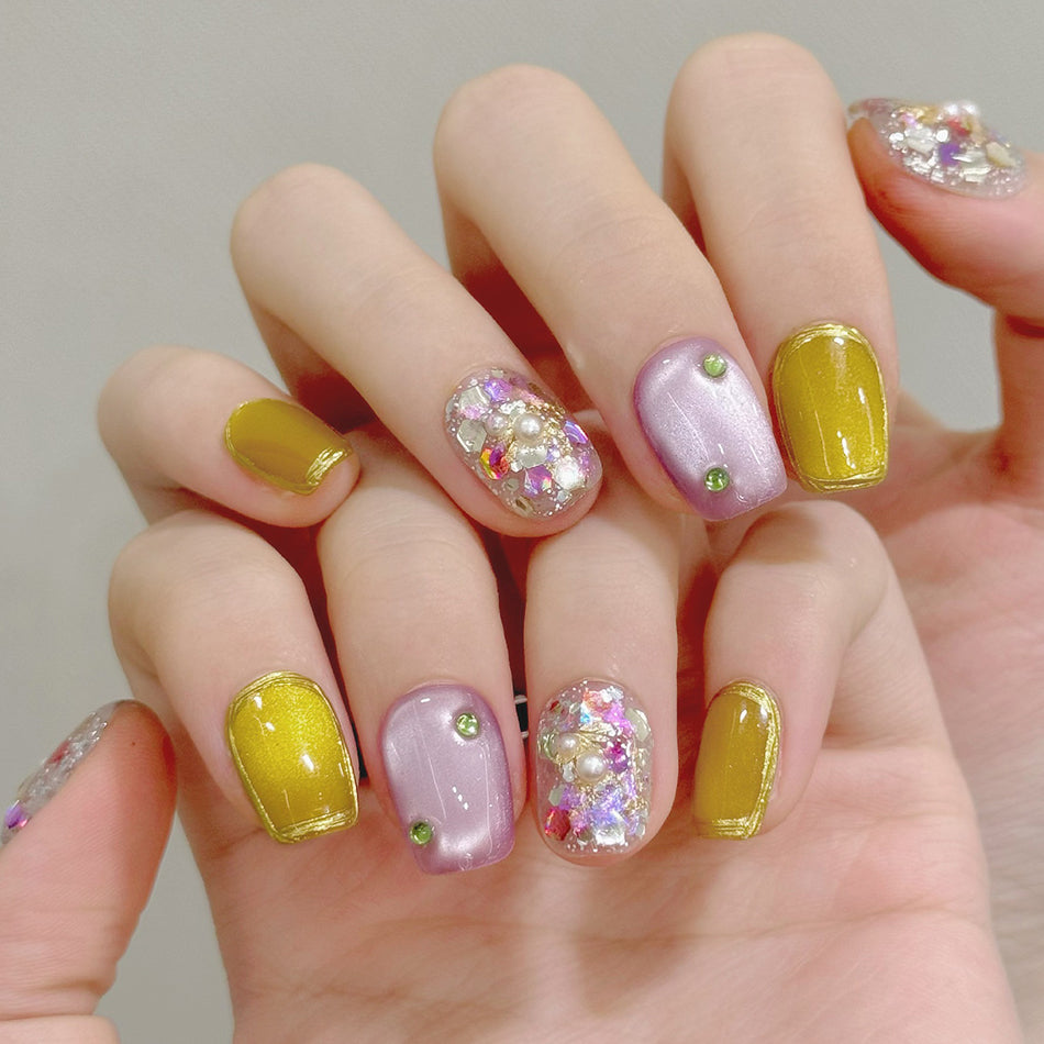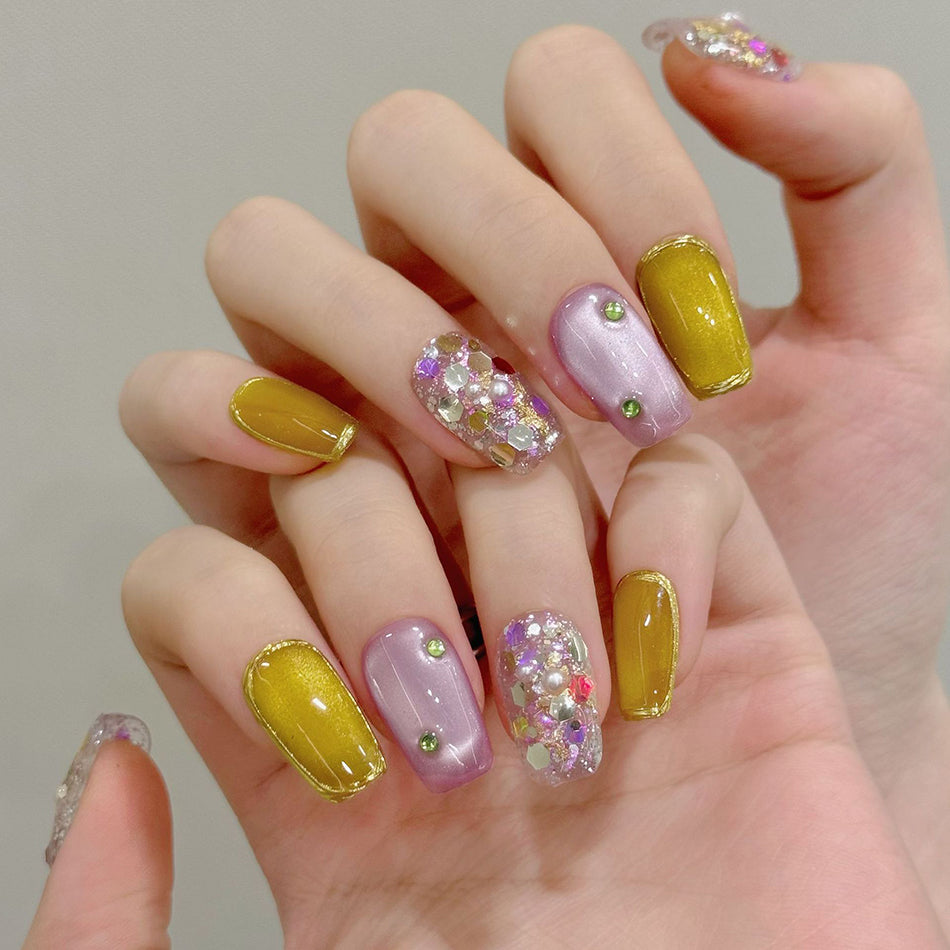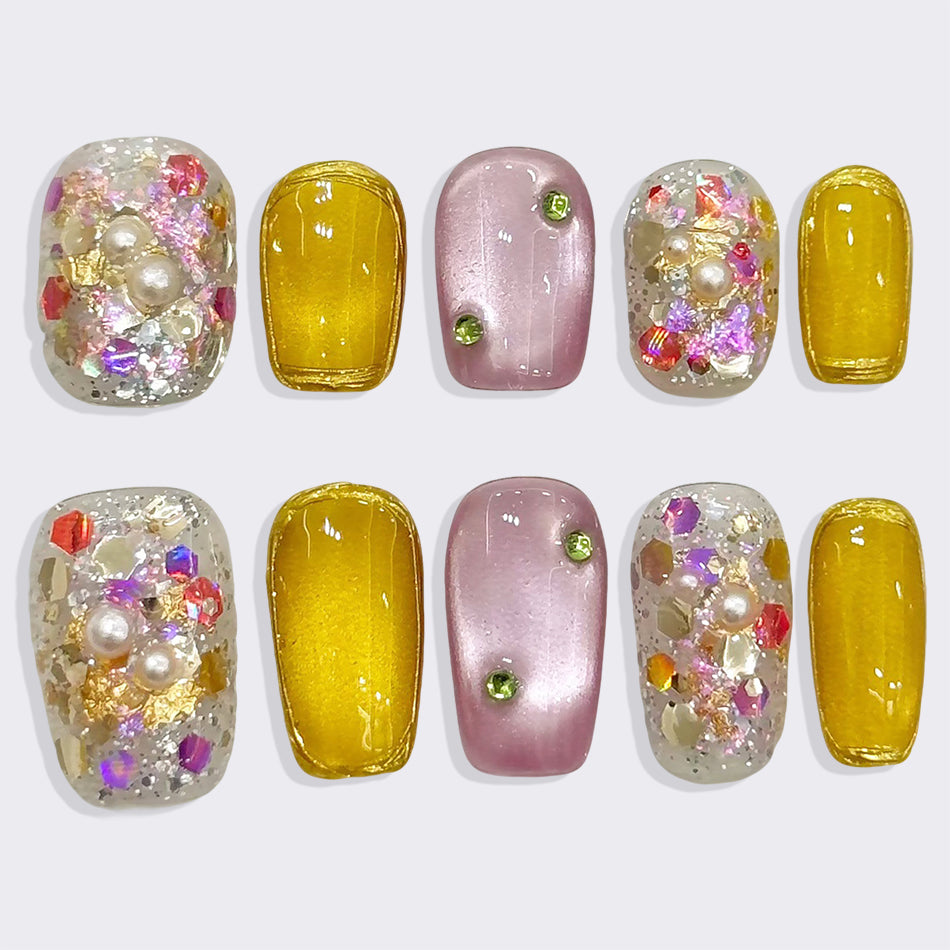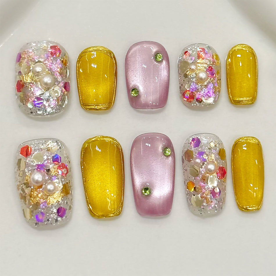Bold and dazzling nails with rich gold accents, iridescent glitter, pearls, and colorful rhinestones . A luxurious design that blends elegance with vibrant sparkle—perfect for making a statement with bold, radiant style.
