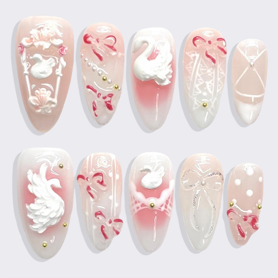 Delicate and dreamy, these press-on nails feature soft pink gradients, 3D swan silhouettes, and elegant lace details. Adorned with pearls, ribbon accents, and floral motifs, they evoke a romantic ballet in pastel hues—perfect for those who love gentle luxury and feminine charm.