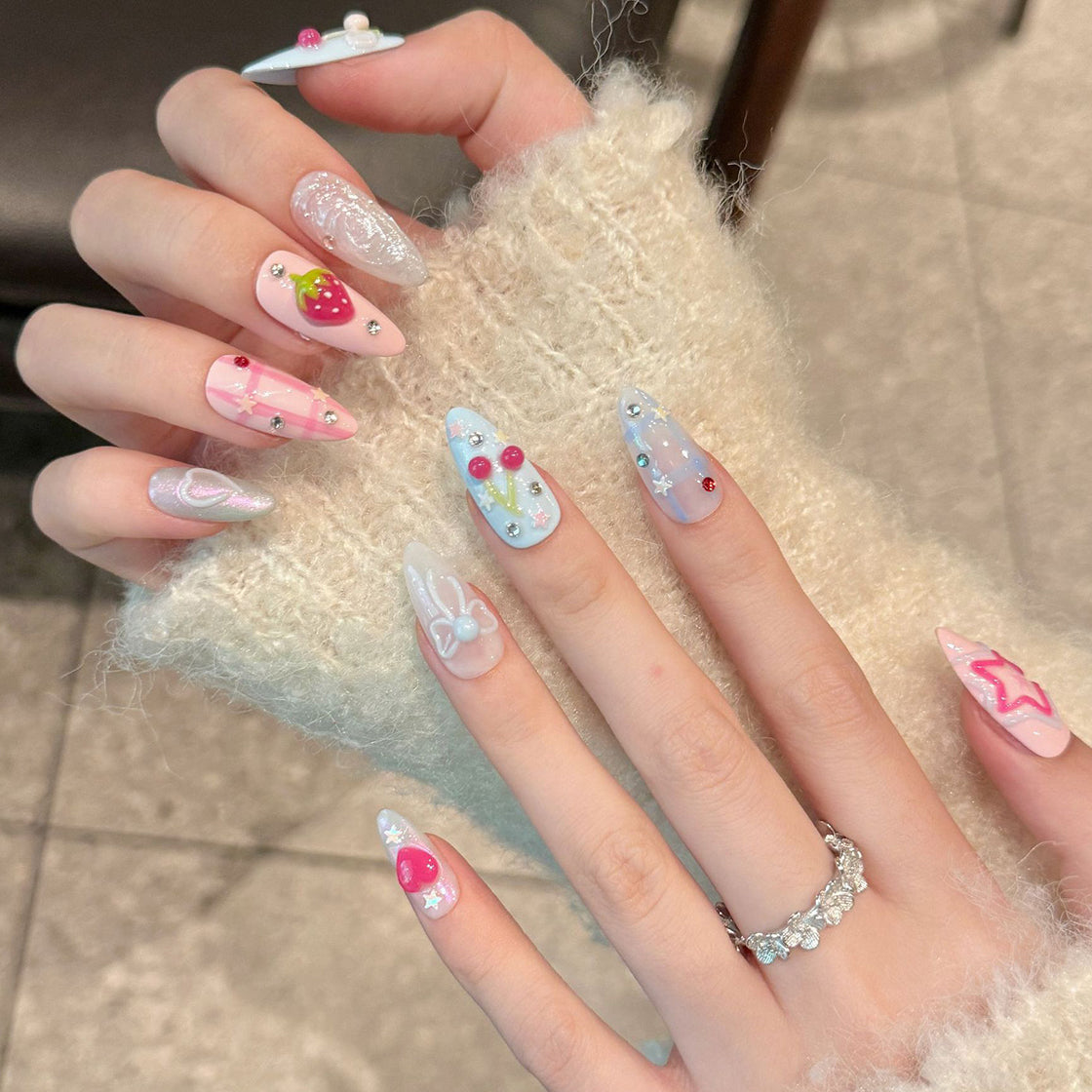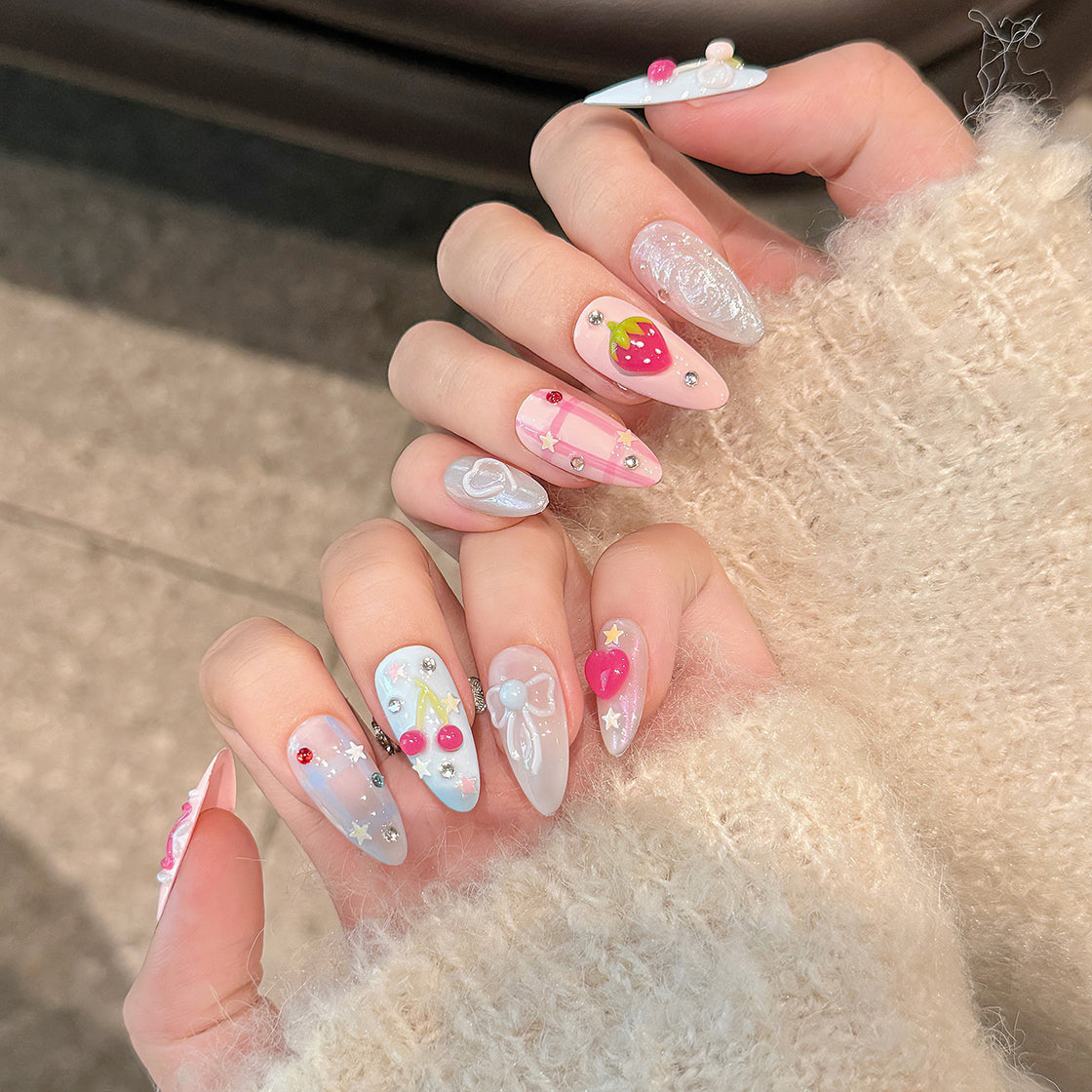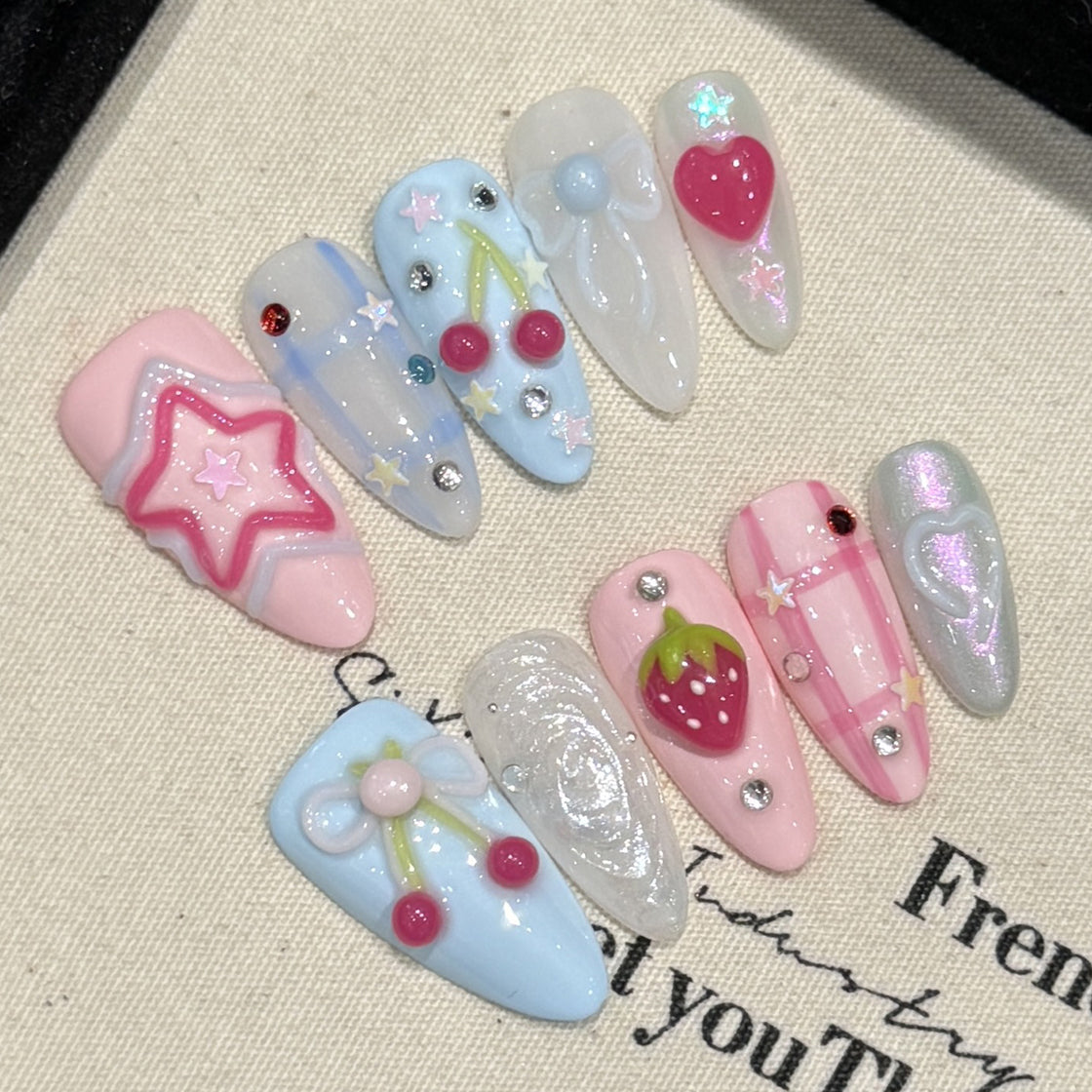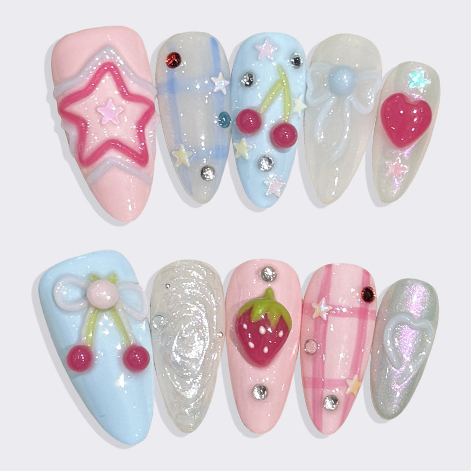 A playful blend of pastel hues, 3D strawberries, stars, bows, and glittery accents brings a sweet, dreamy charm to these press-on nails. Perfect for adding a touch of youthful magic and girlish elegance to any look—where whimsy meets sparkle.