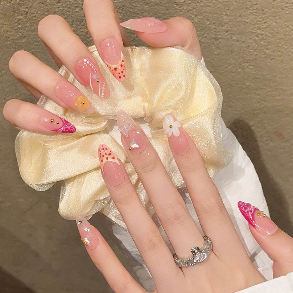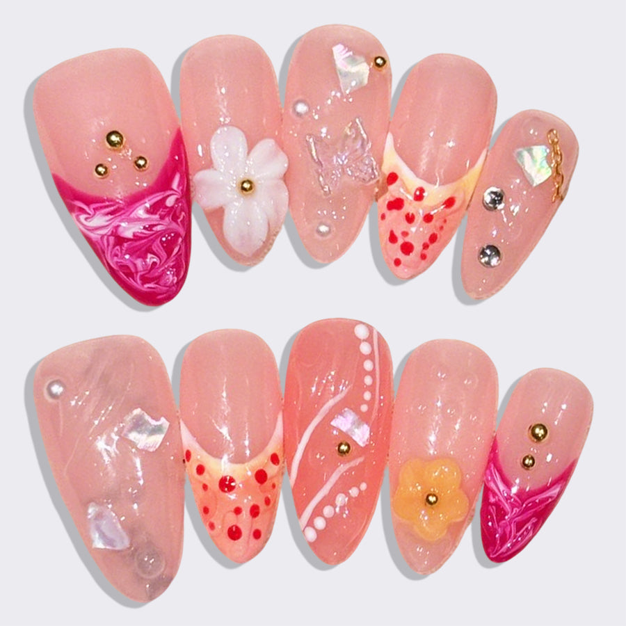 A soft pink nude base adorned with dainty 3D flowers, shimmering beads —these press-on nails exude refined femininity. Clean lines and delicate details create a timeless, elegant look, perfect for everyday grace or special moments alike.