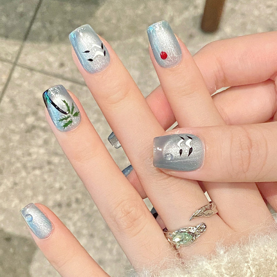 A serene escape to the beach—soft turquoise glitter meets palm trees, flying birds, and a glowing red sun. These nails capture the calm beauty of coastal mornings, blending nature’s artistry with delicate sparkle for a refreshing, tropical vibe.