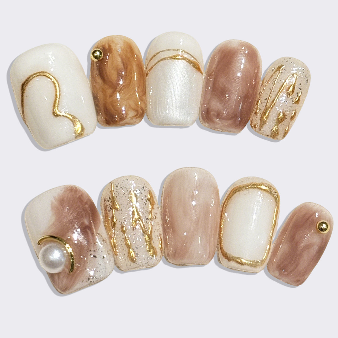 Artistic press-on nails inspired by natural stone, featuring warm earthy tones, elegant gold lines accents, and delicate pearls. Each nail blends texture and luxury for a refined, sculptural look—perfect for those who love minimalist elegance with a touch of opulence.